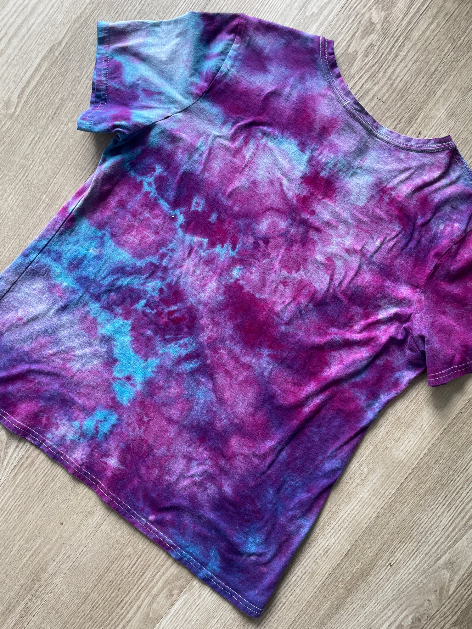 2X Juniors' Handprinted Snakes and Vines Galaxy Tie Dye Short Sleeve T-Shirt | One-Of-a-Kind Upcycled Purple, Pink, and Blue Ice Dye Top