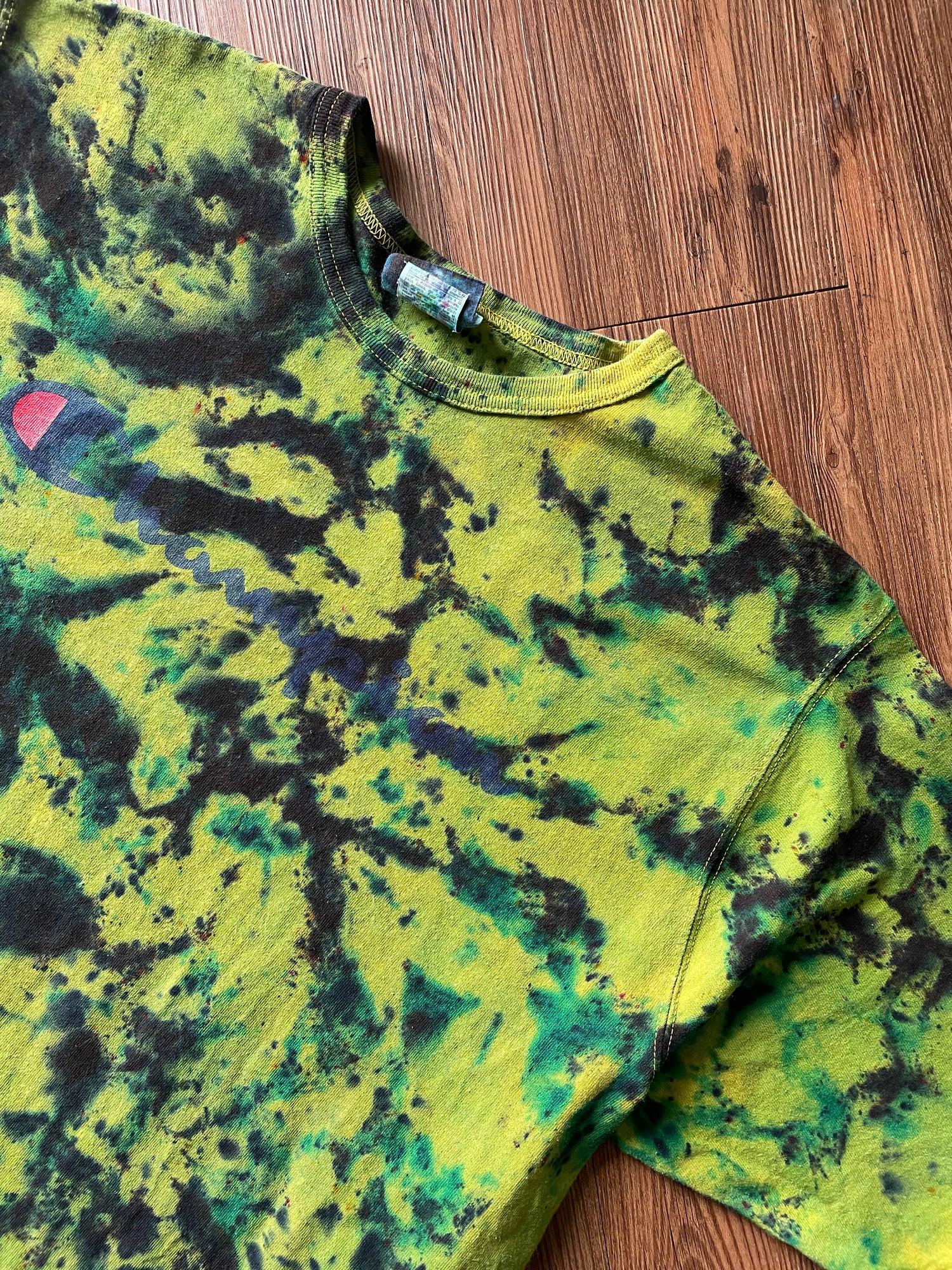 2XL Men’s Champion Handmade Tie Dye T-Shirt | Green and Black Crumpled Tie Dye Short Sleeve