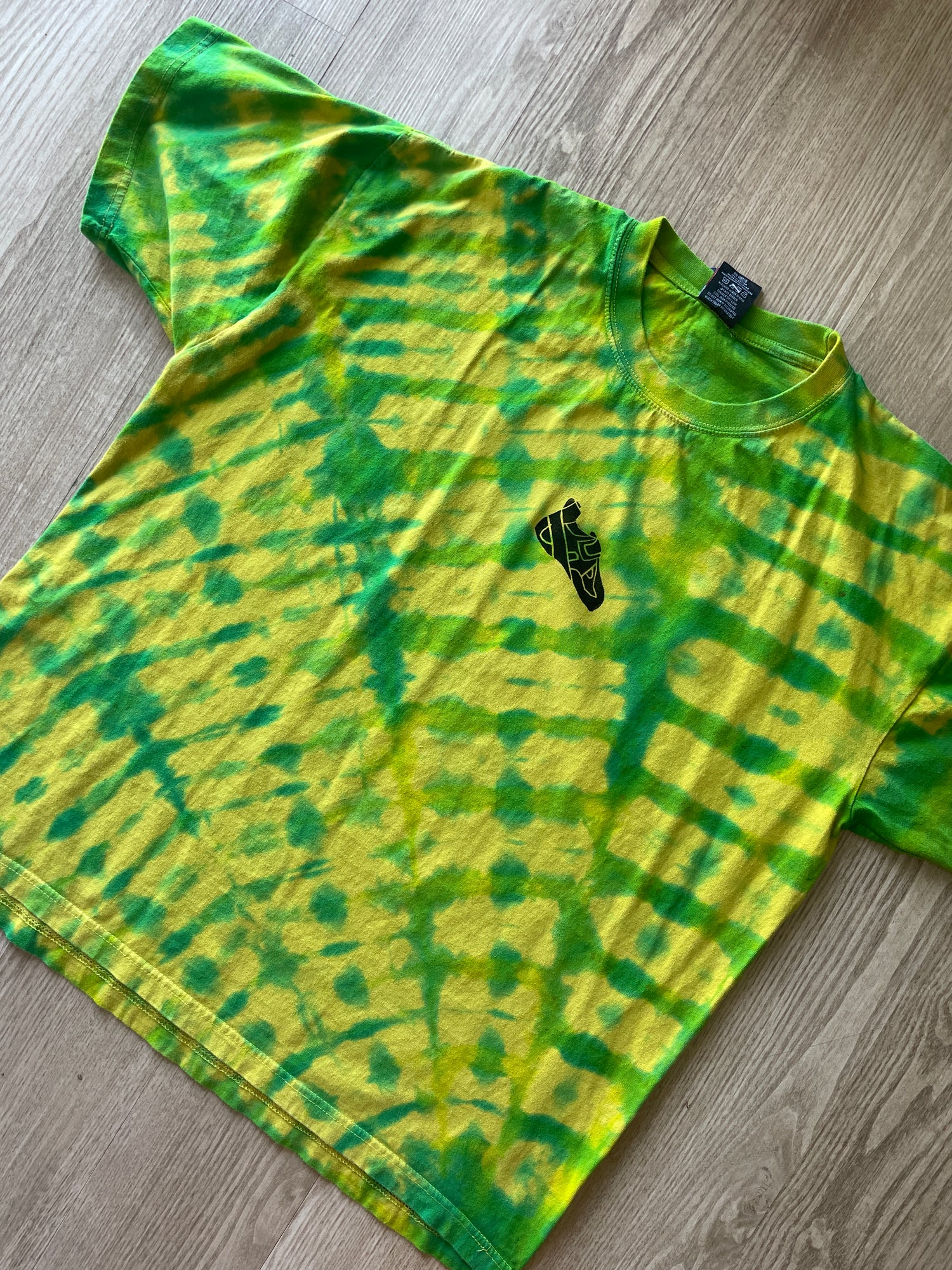 2XL Men’s Climbing Shoe Handmade Tie Dyed T-Shirt | One-Of-a-Kind Yellow, Blue, and Green Pleated Short Sleeve