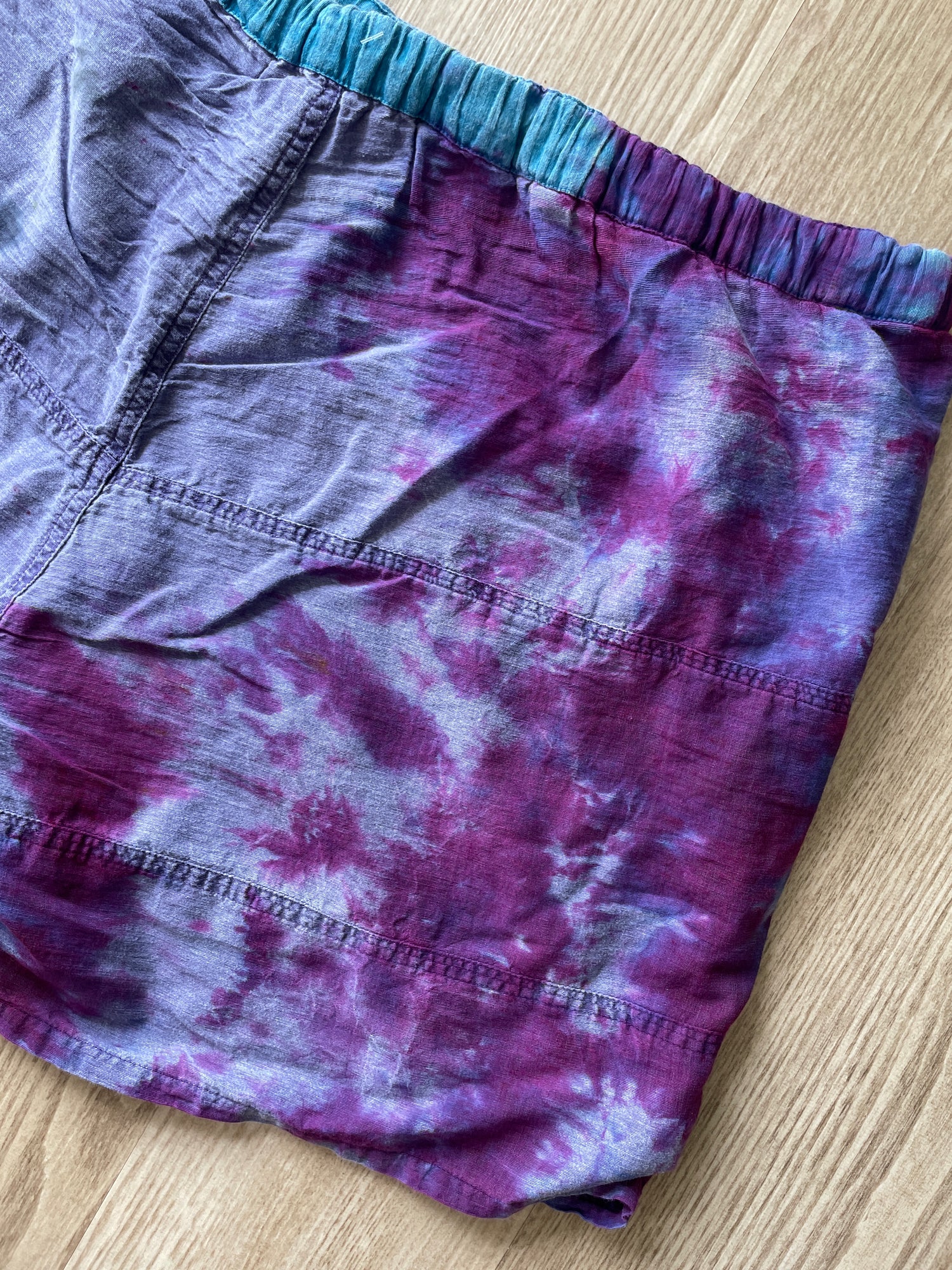 light purple shorts dyed with shades of pink and purple crumpled tie dye pattern