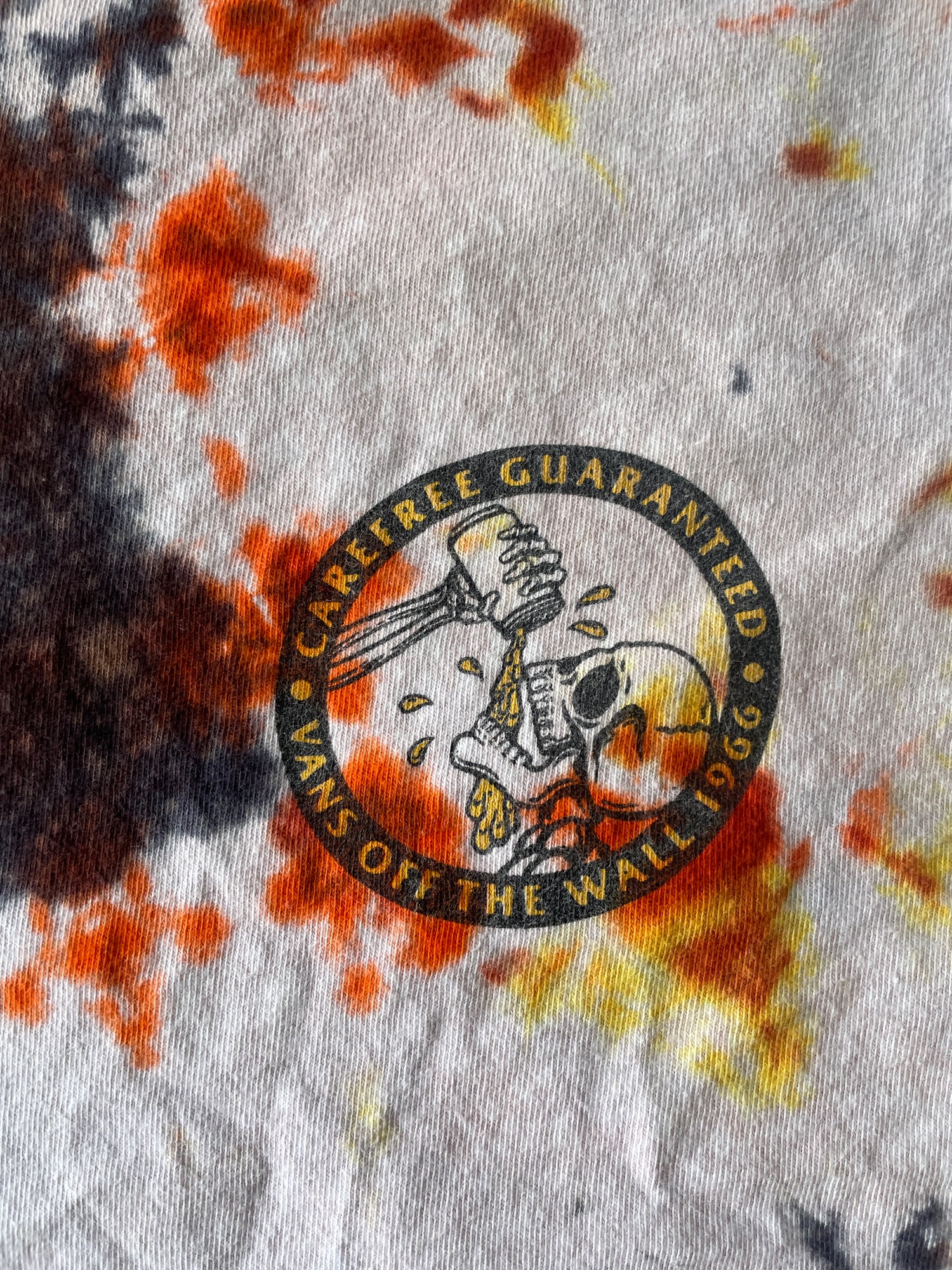2XL Men’s Vans Skeleton Carefree Guaranteed Handmade Geode Tie Dye T-Shirt | Orange, Yellow, and Black Long Sleeve Tee