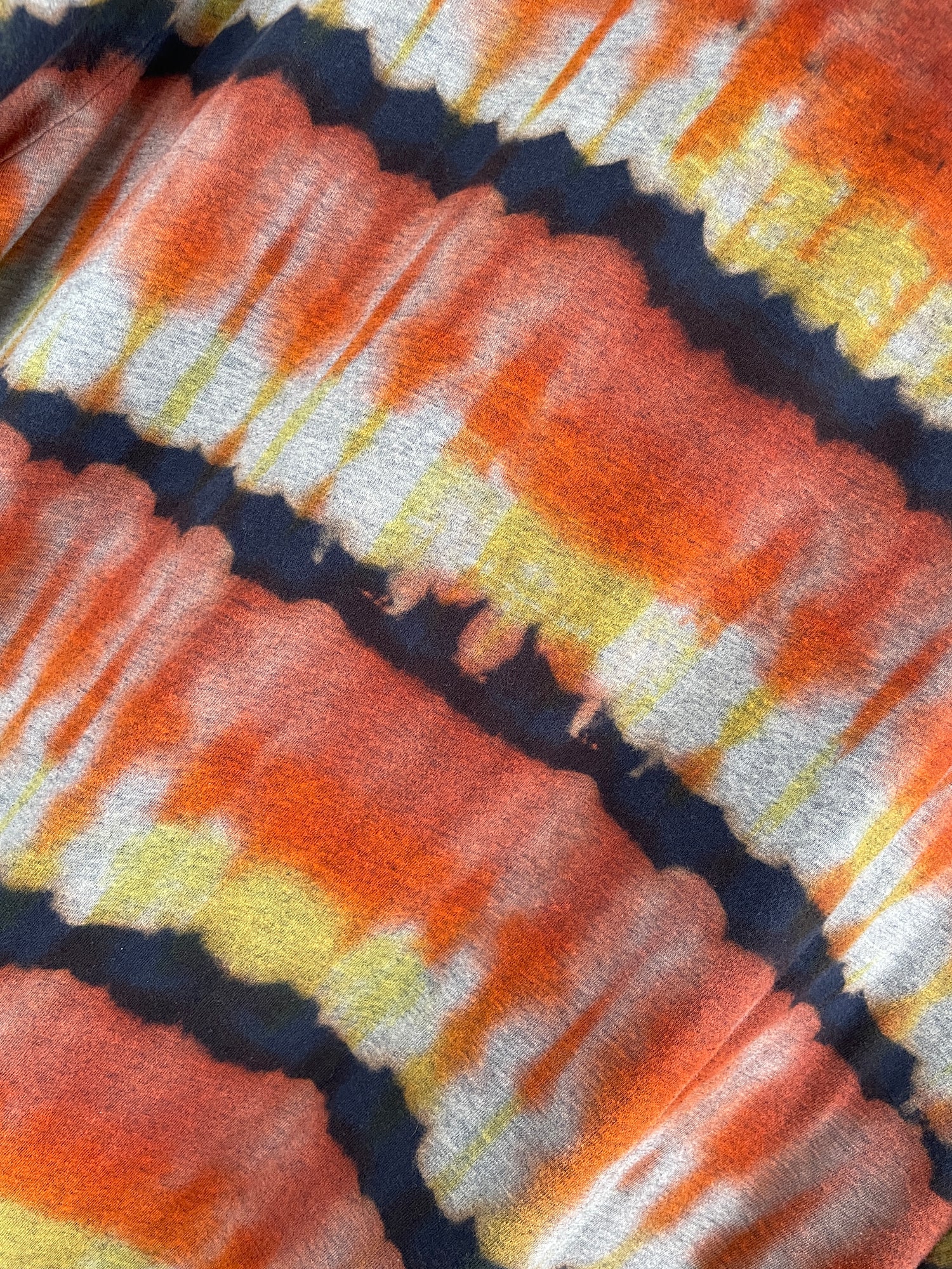 black t-shirt dyed with red, yellow, and orange pleated tie dye pattern