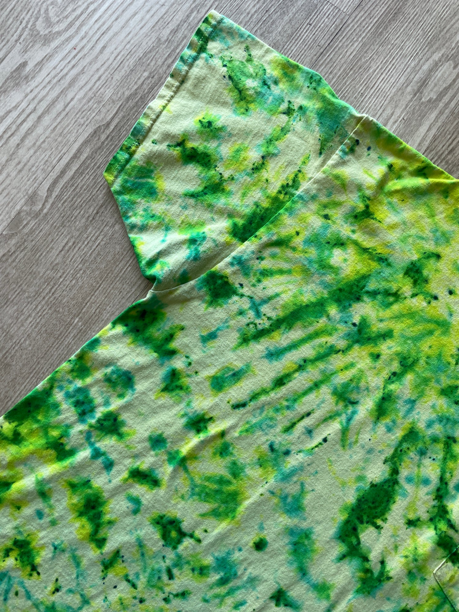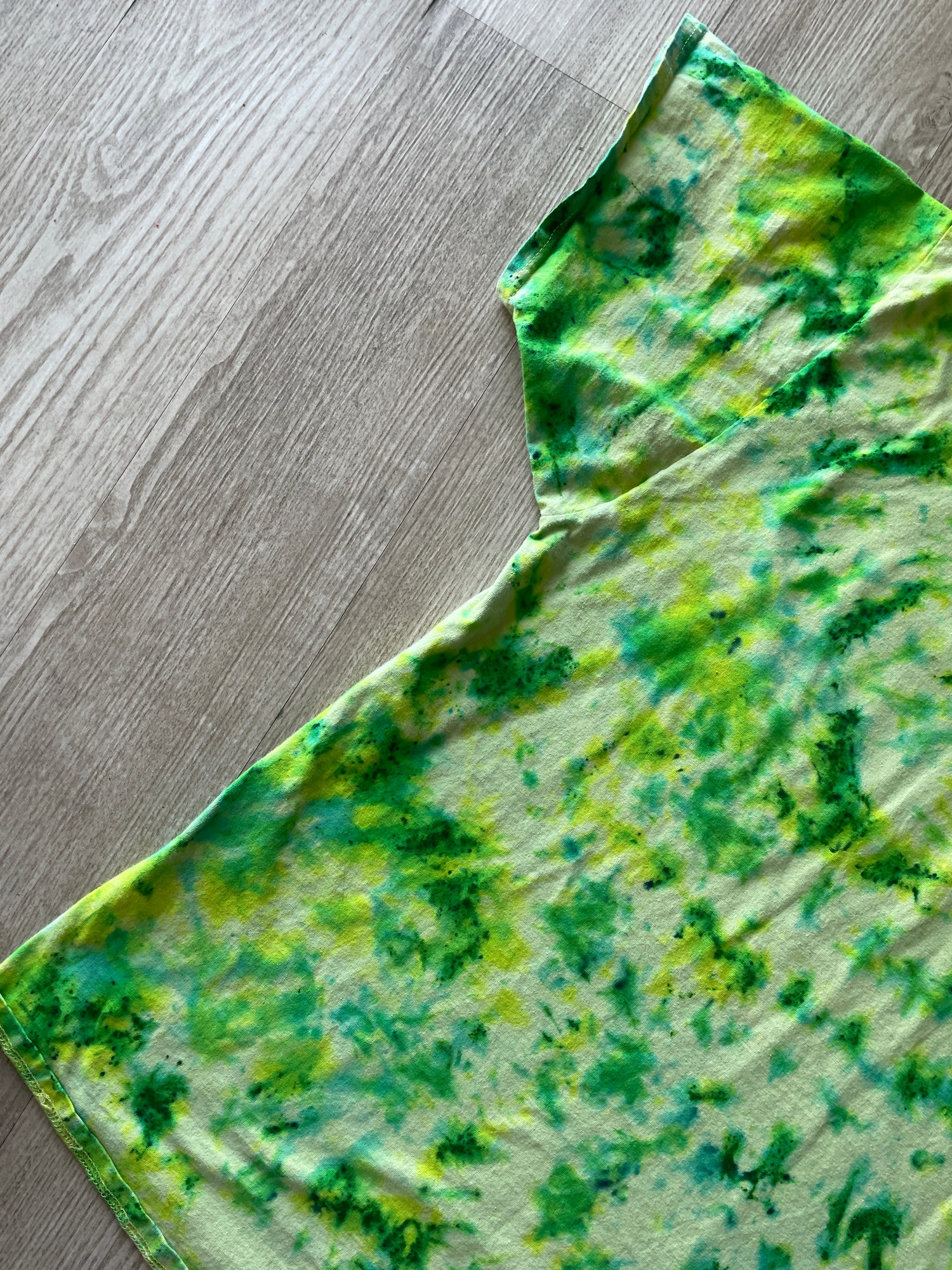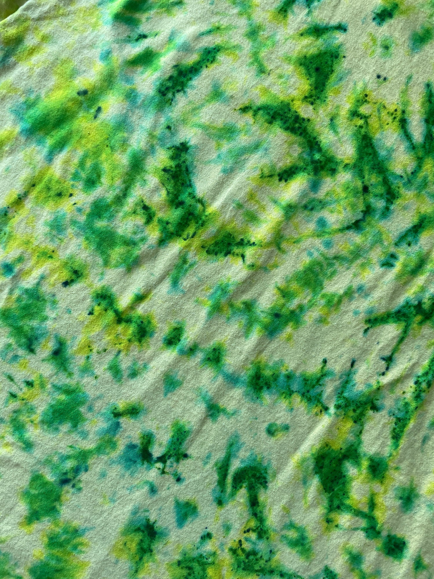 yellow tshirt dyed with shades of blue and green crumpled tie dye pattern