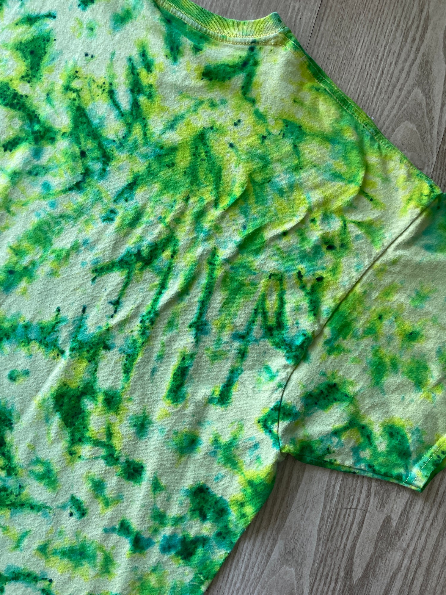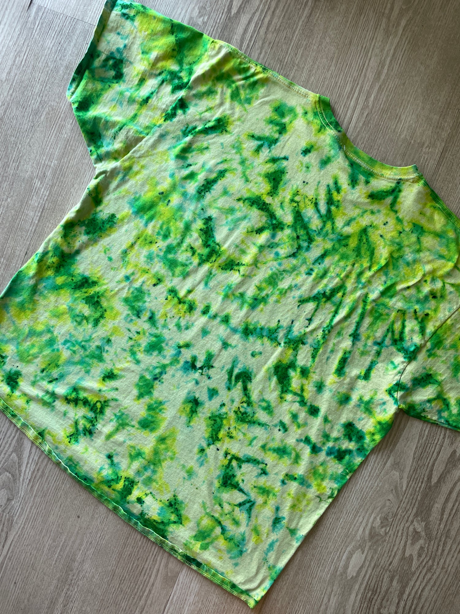 3XL Men’s Climbing Shoe Handmade Tie Dyed T-Shirt | One-Of-a-Kind Yellow, Blue, and Green Crumpled Short Sleeve
