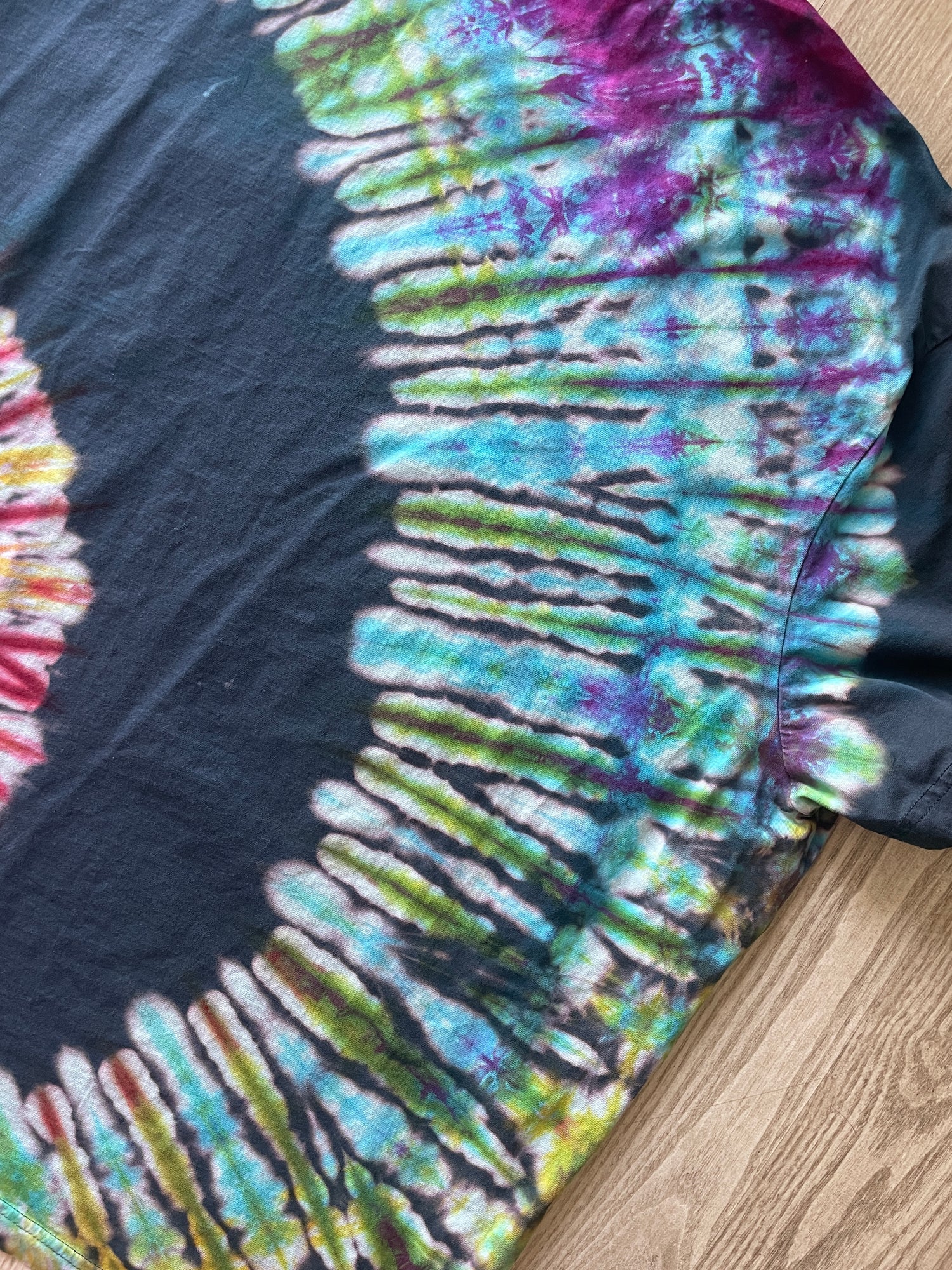 3XL Men’s Handprinted Climbing Shoe Reverse Tie Dye Handmade T-Shirt | One-Of-a-Kind Black and Rainbow Spiral Short Sleeve