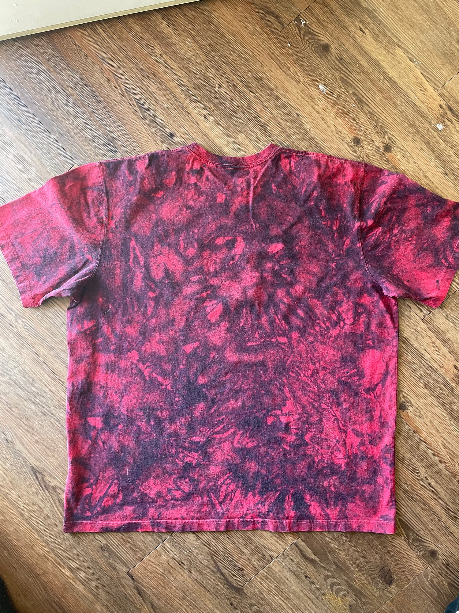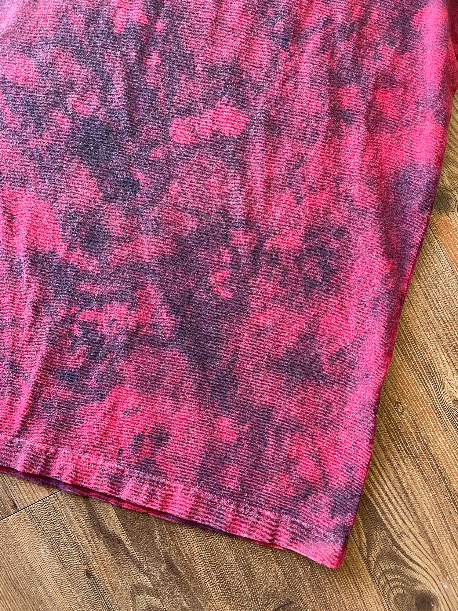 red tshirt bleached and dyed with black and gray dyes
