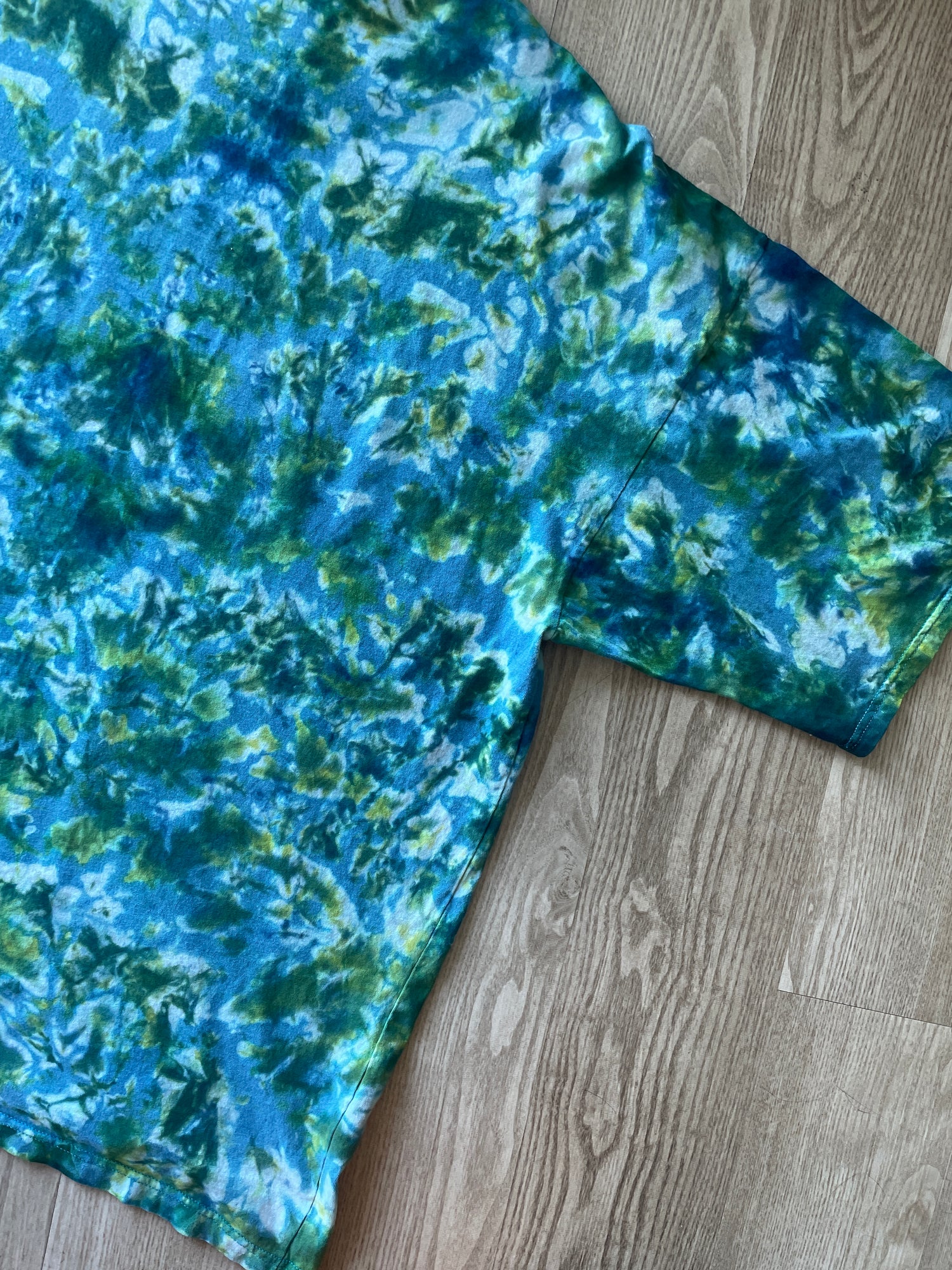 3XL Men's Handprinted Snakes and Vines Handmade Tie Dye Short Sleeve T-Shirt | One-Of-a-Kind Upcycled Blue, Green, and White Crumpled Top