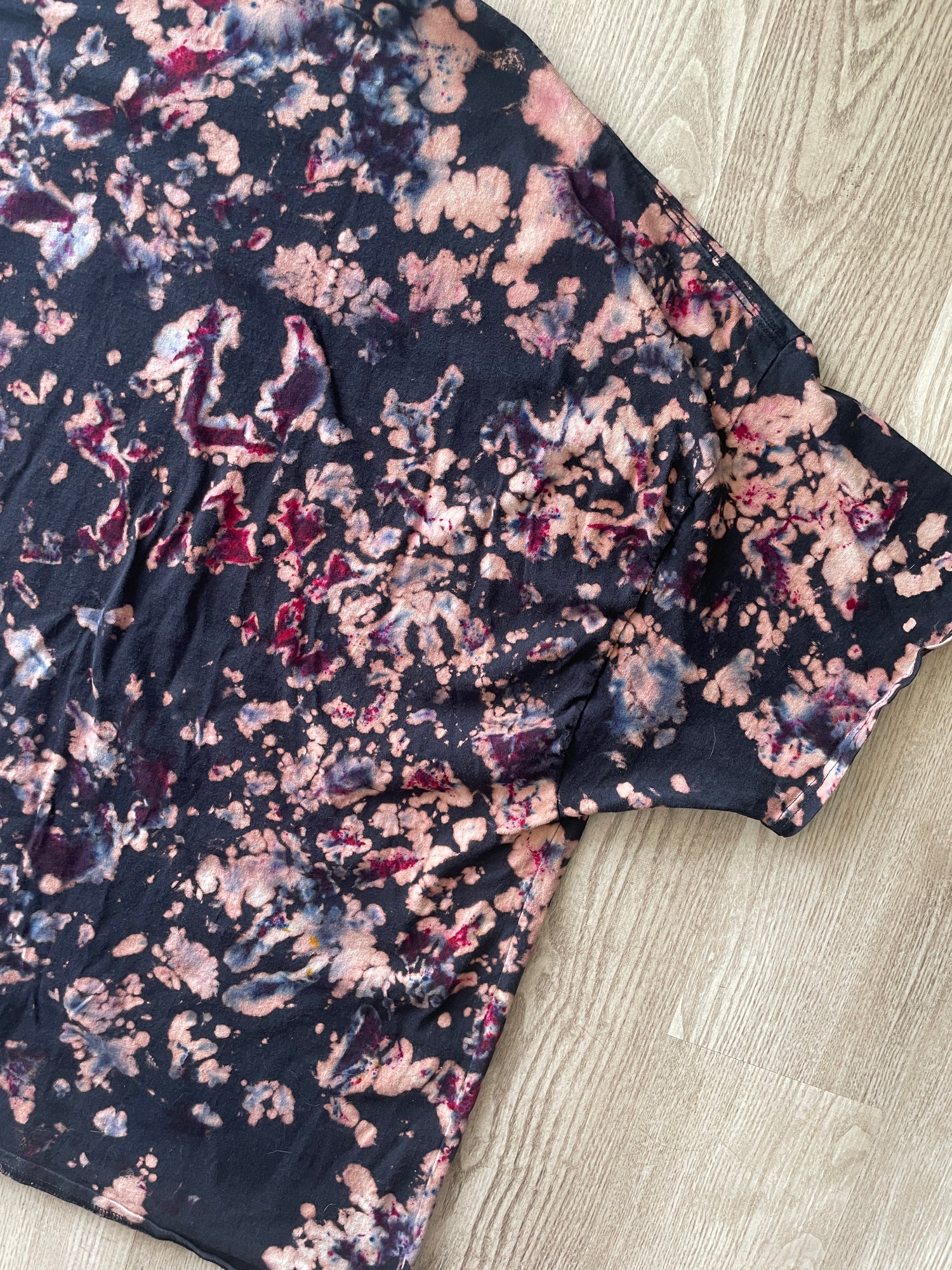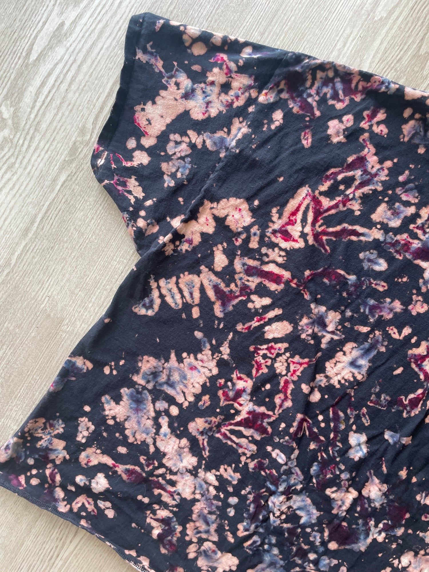 black tshirt bleached and dyed with red and gray crumpled tie dye pattern