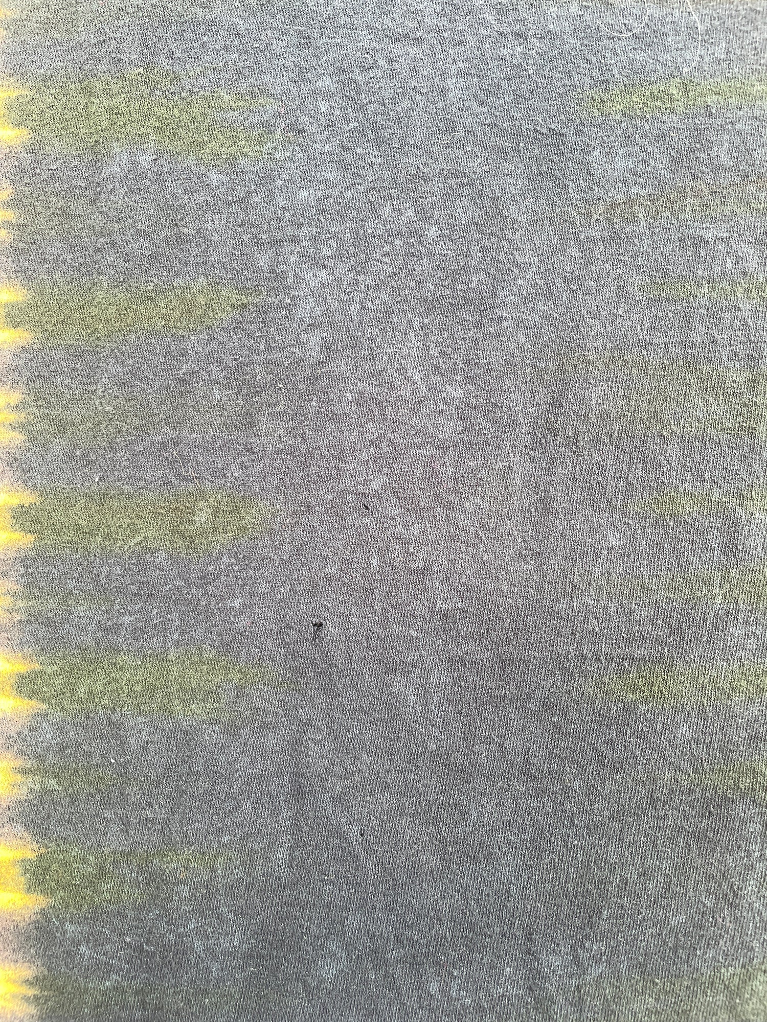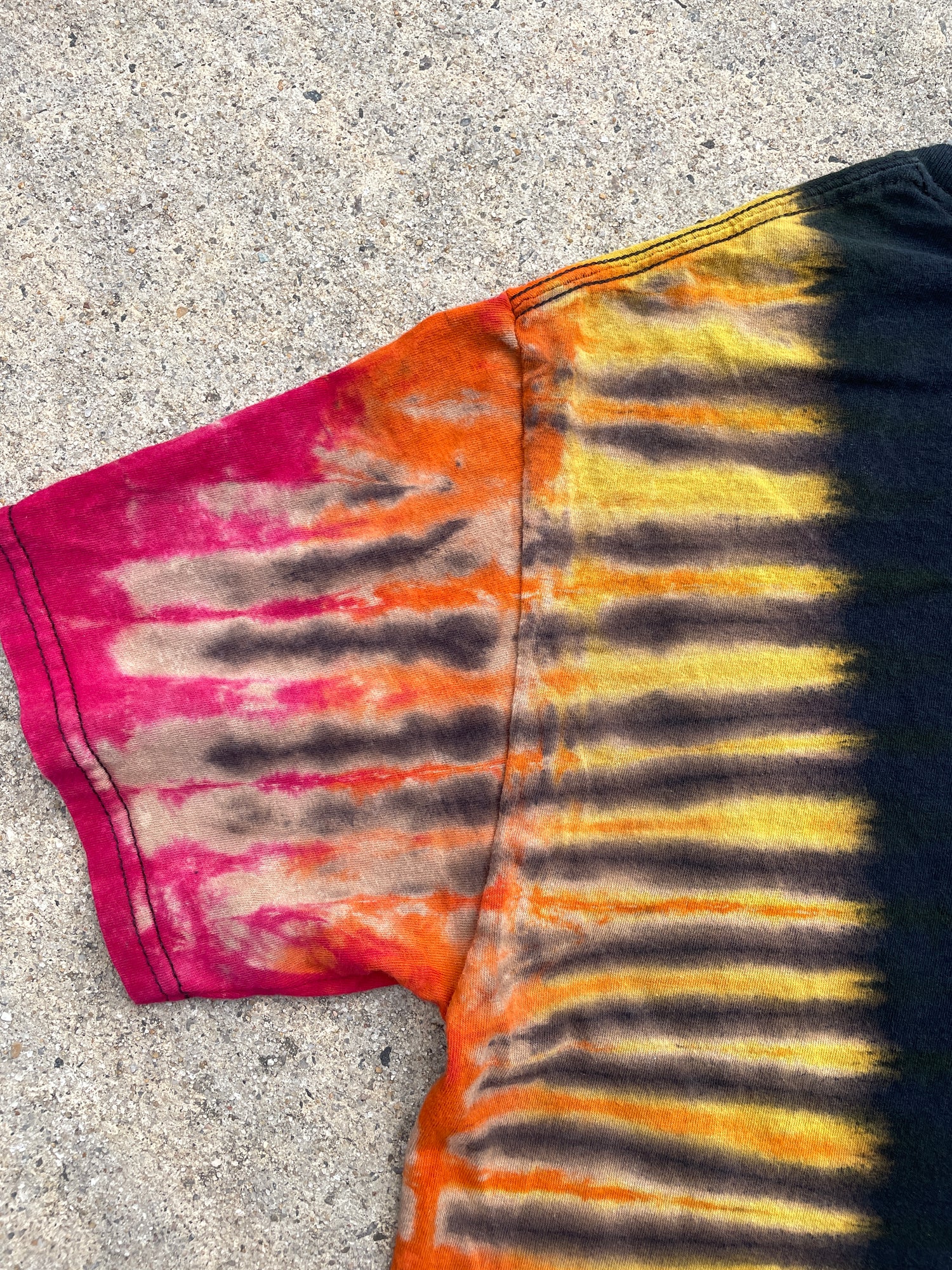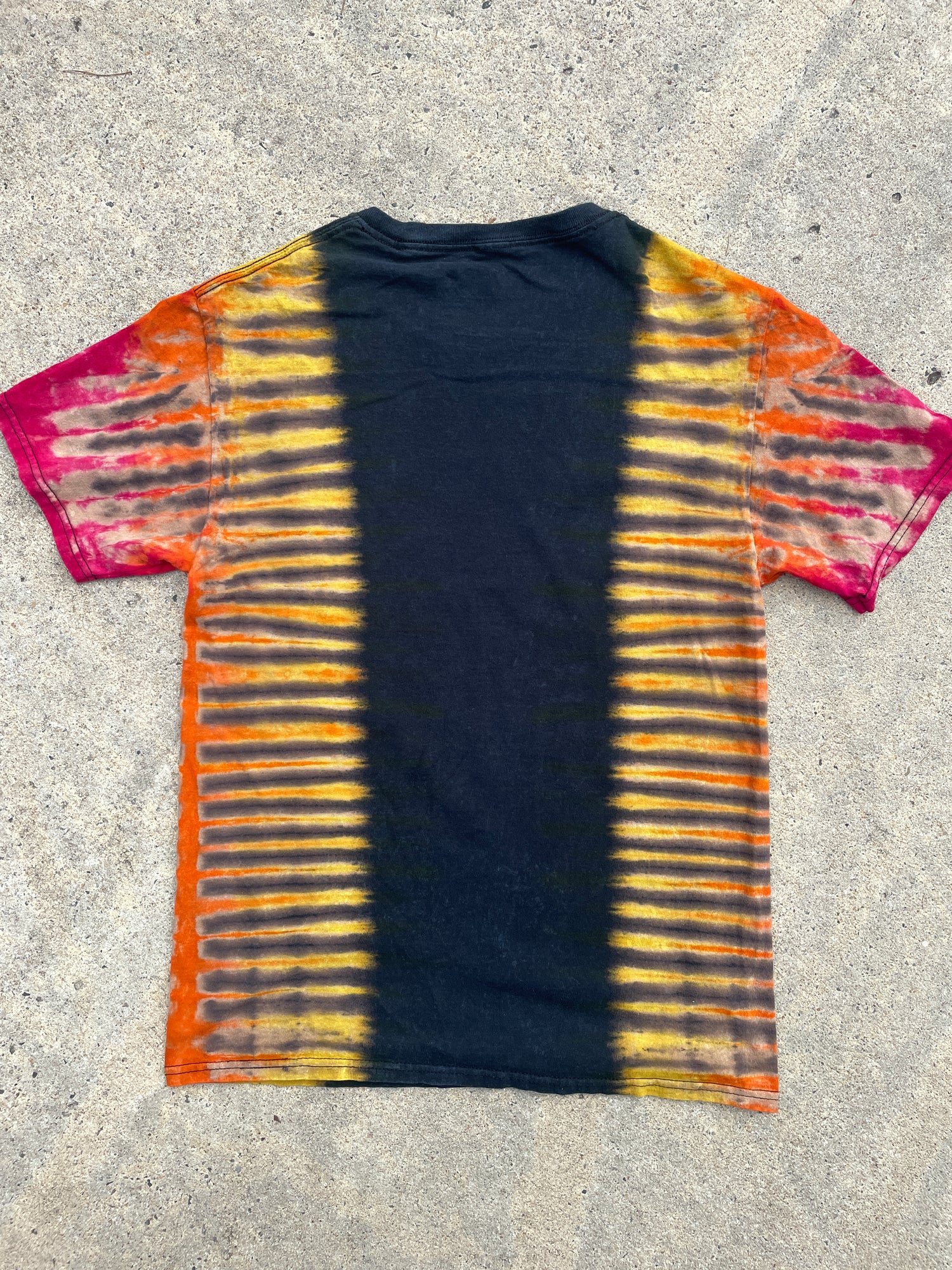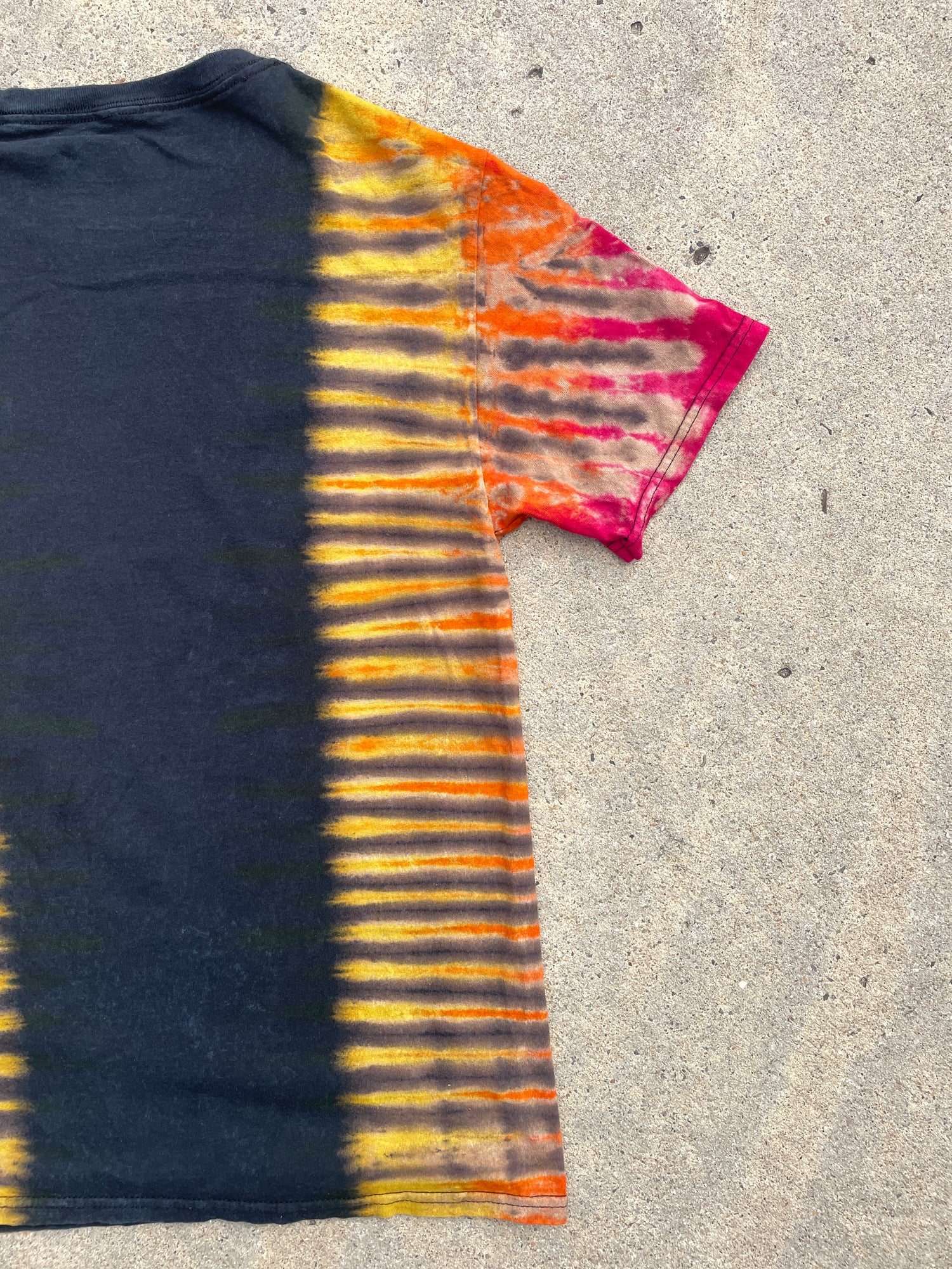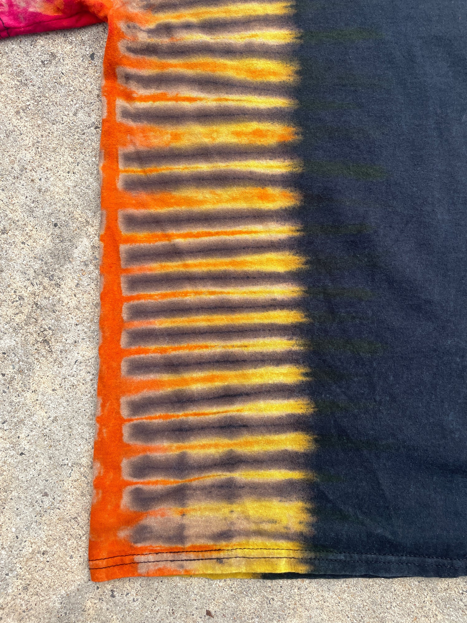 black t-shirt that's had portions of color removed and re-dyed with shades of red, orange, and yellow pleated tie dye pattern