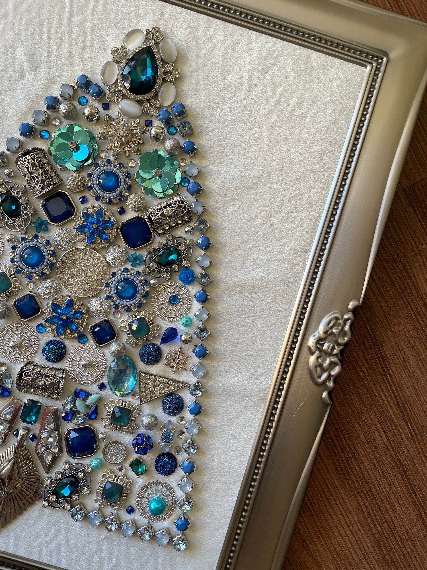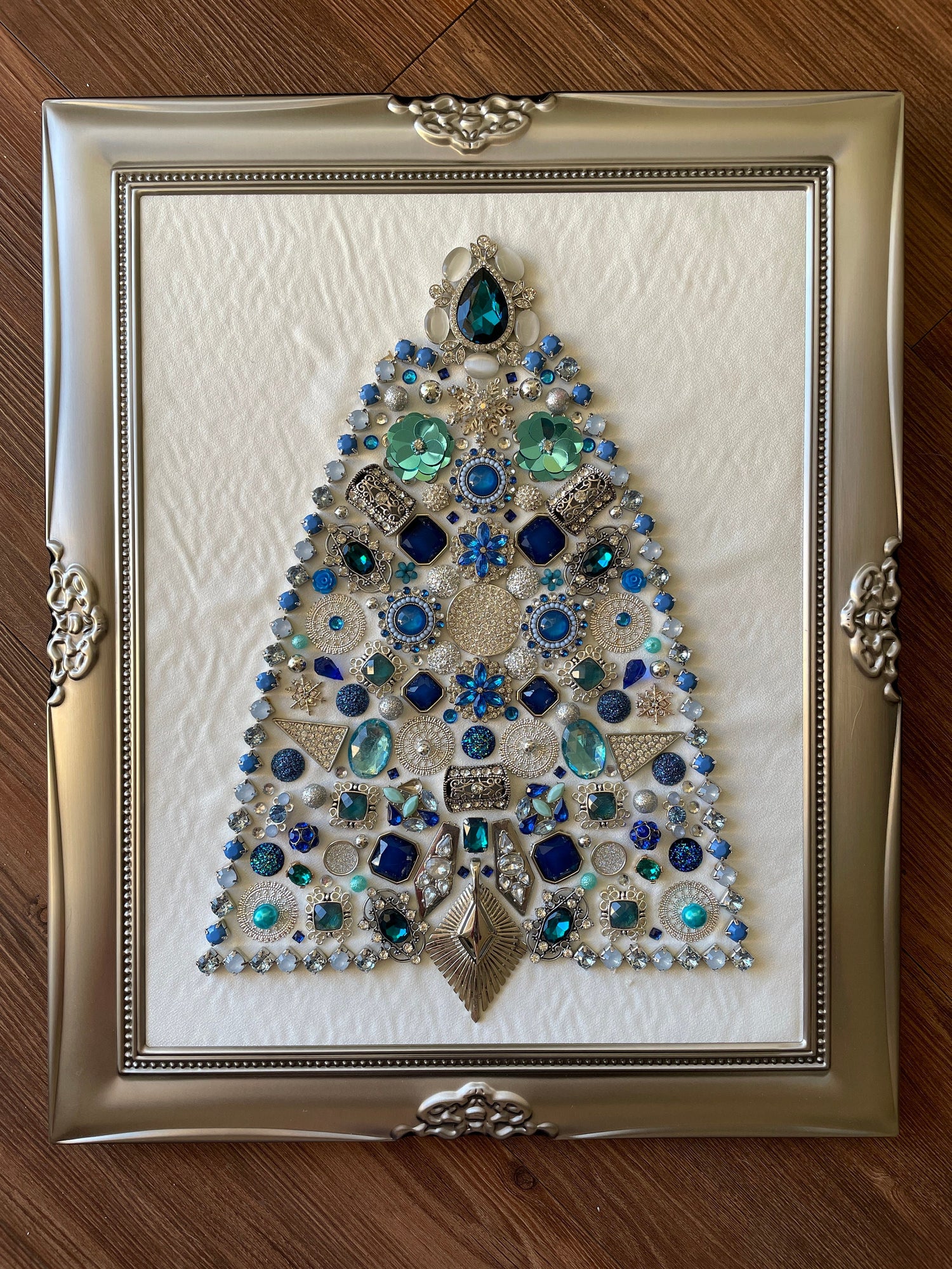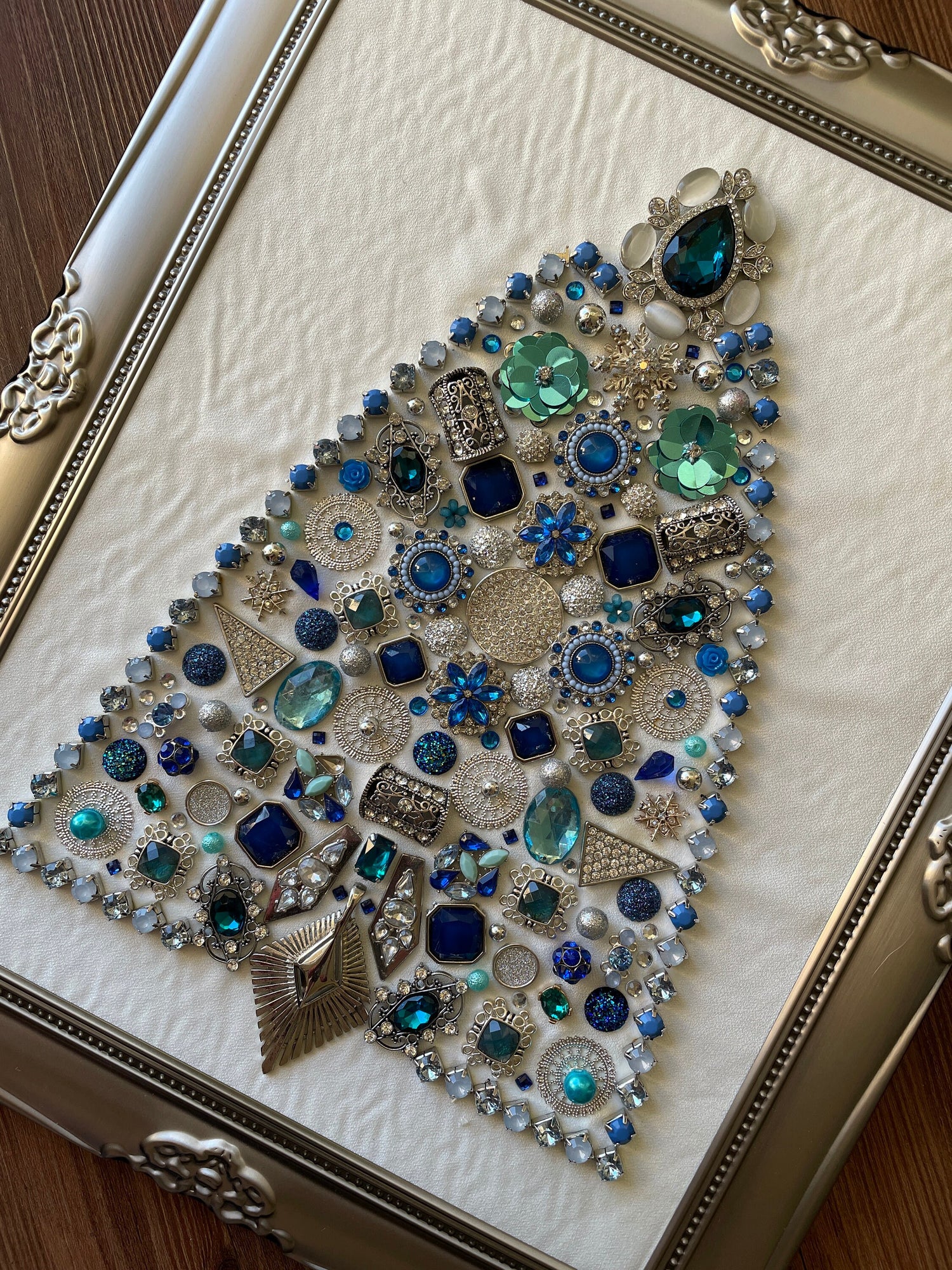 Blue and Silver Framed Jewelry Christmas Tree Handmade with Over 60 Pieces of Vintage & Upcycled Jewelry