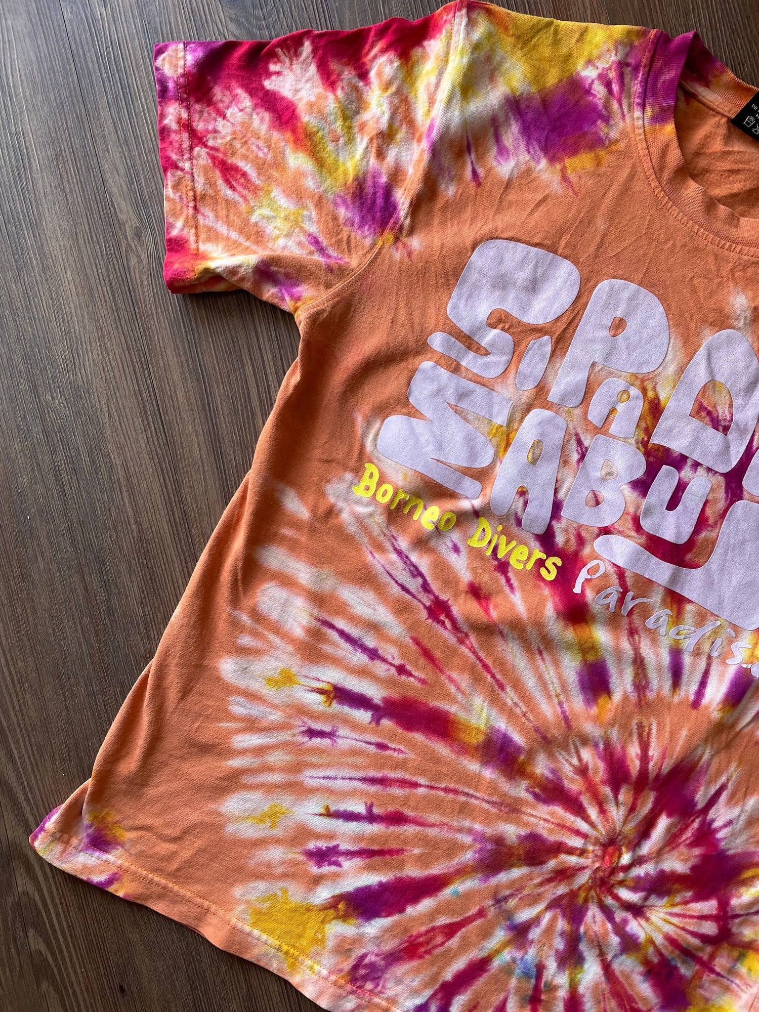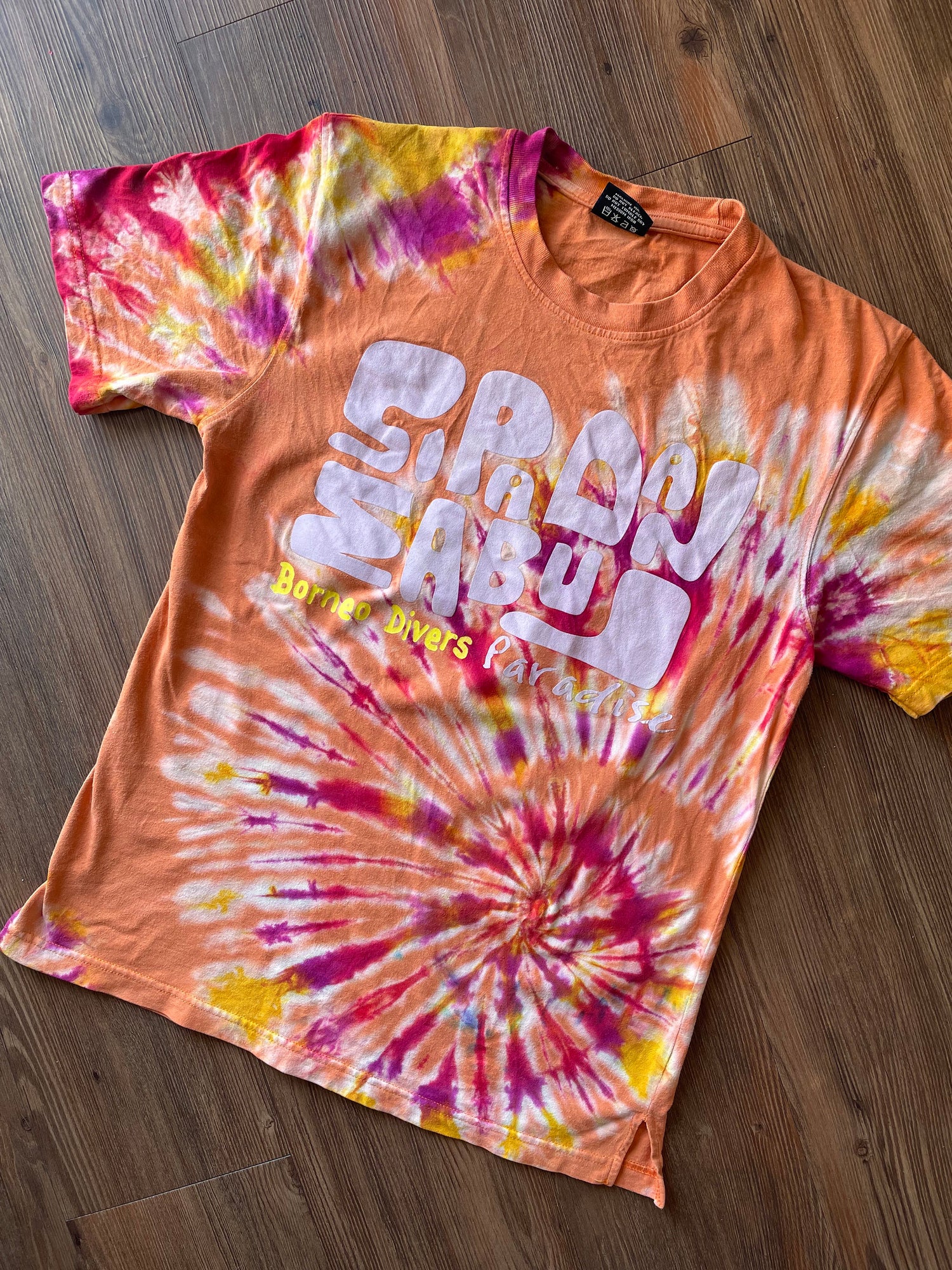 Borneo Divers Mabul Resort Handmade Reverse Tie Dye t-shirt | Orange Scuba Diving Souvenir Unisex Medium Short Sleeve Top