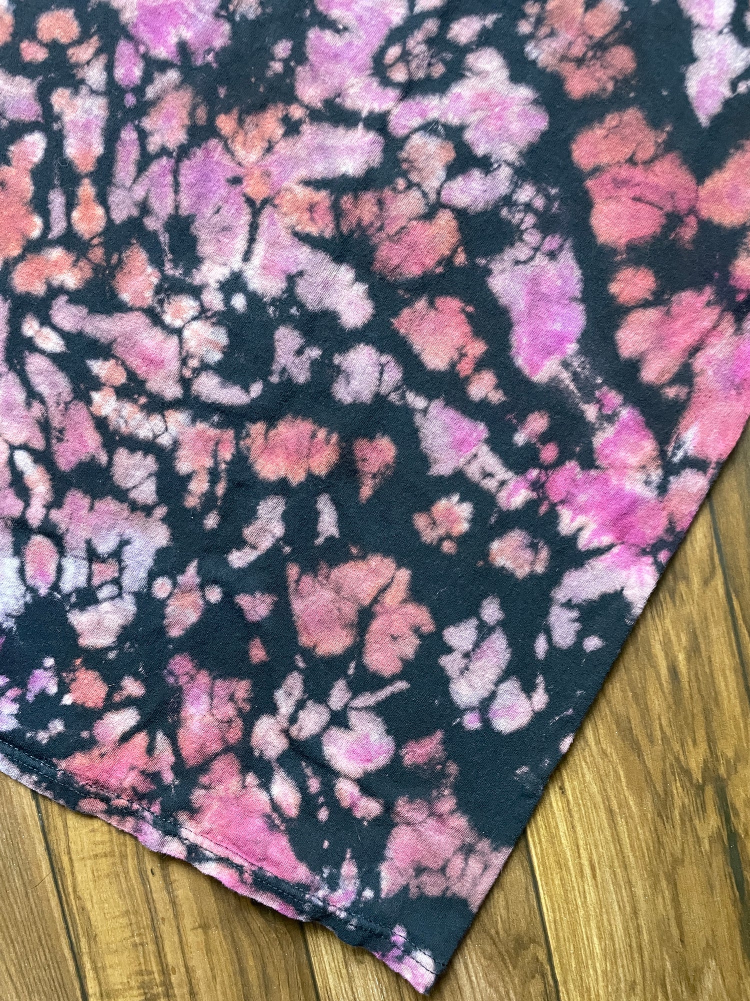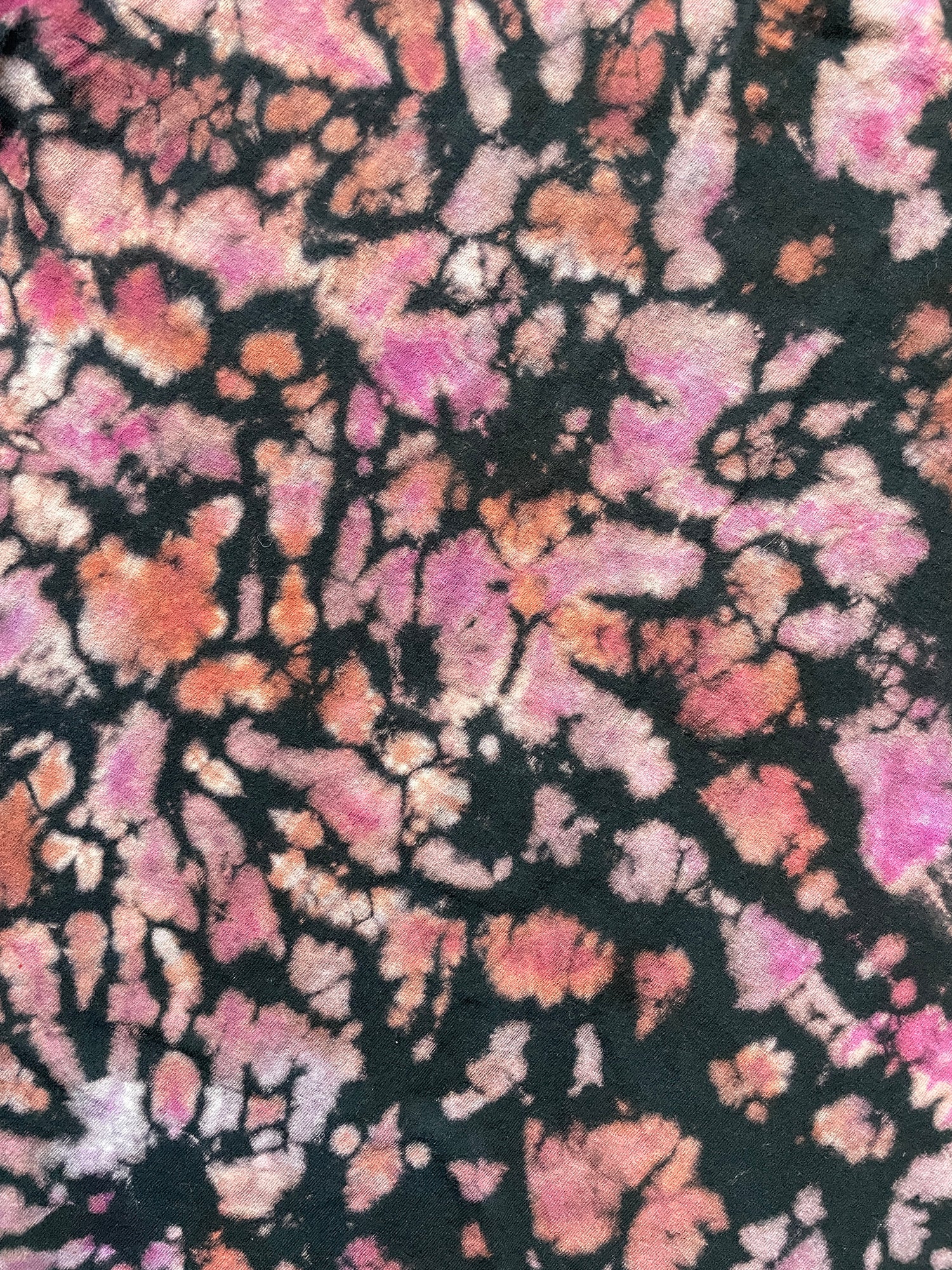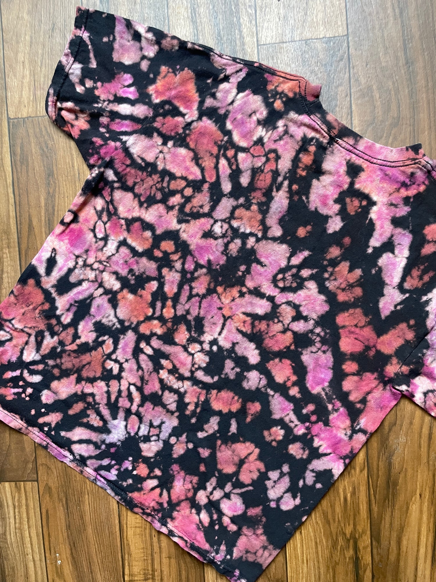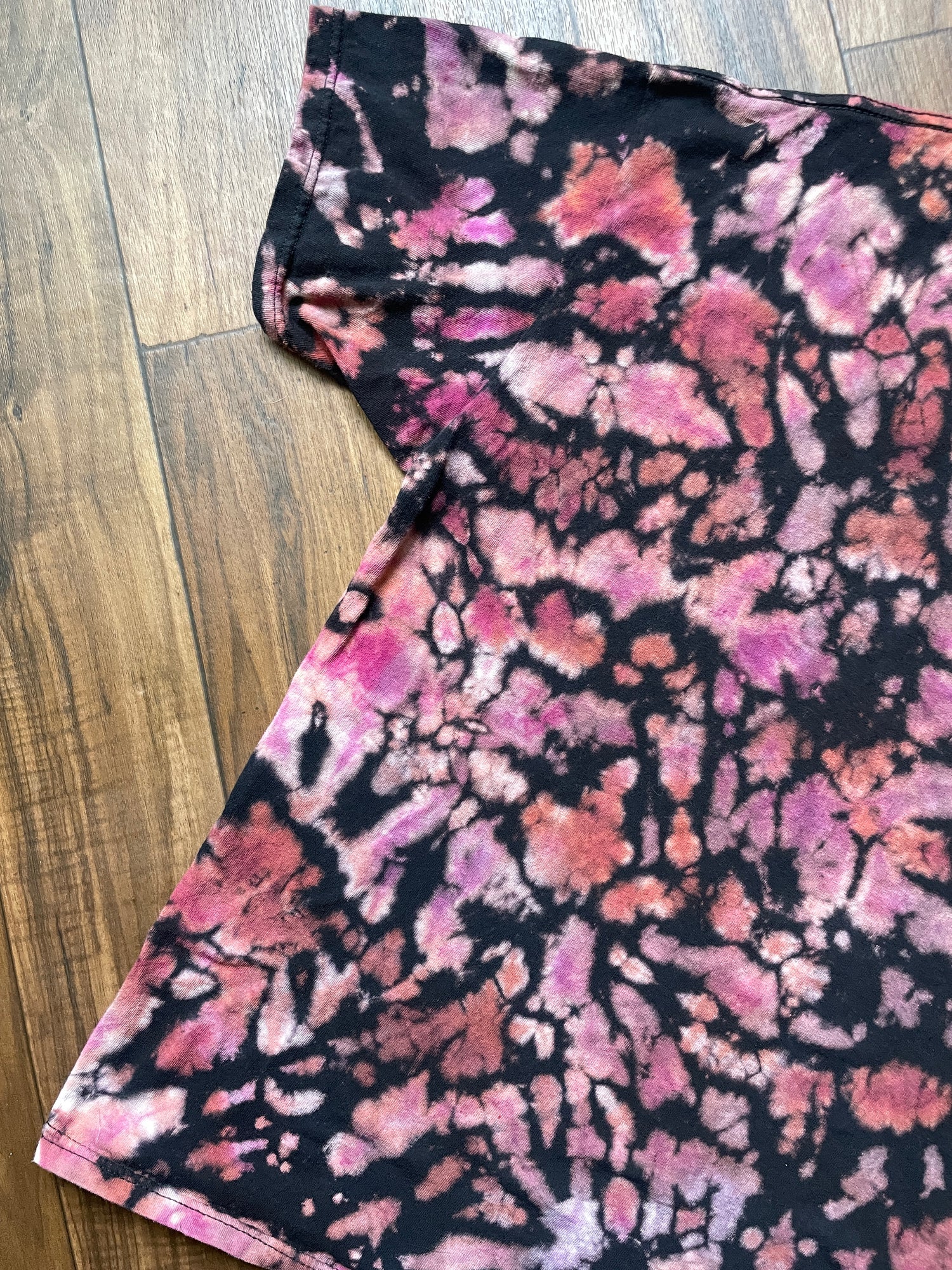 black tshirt bleached and dyed with shades of red and pink crumpled tie dye pattern