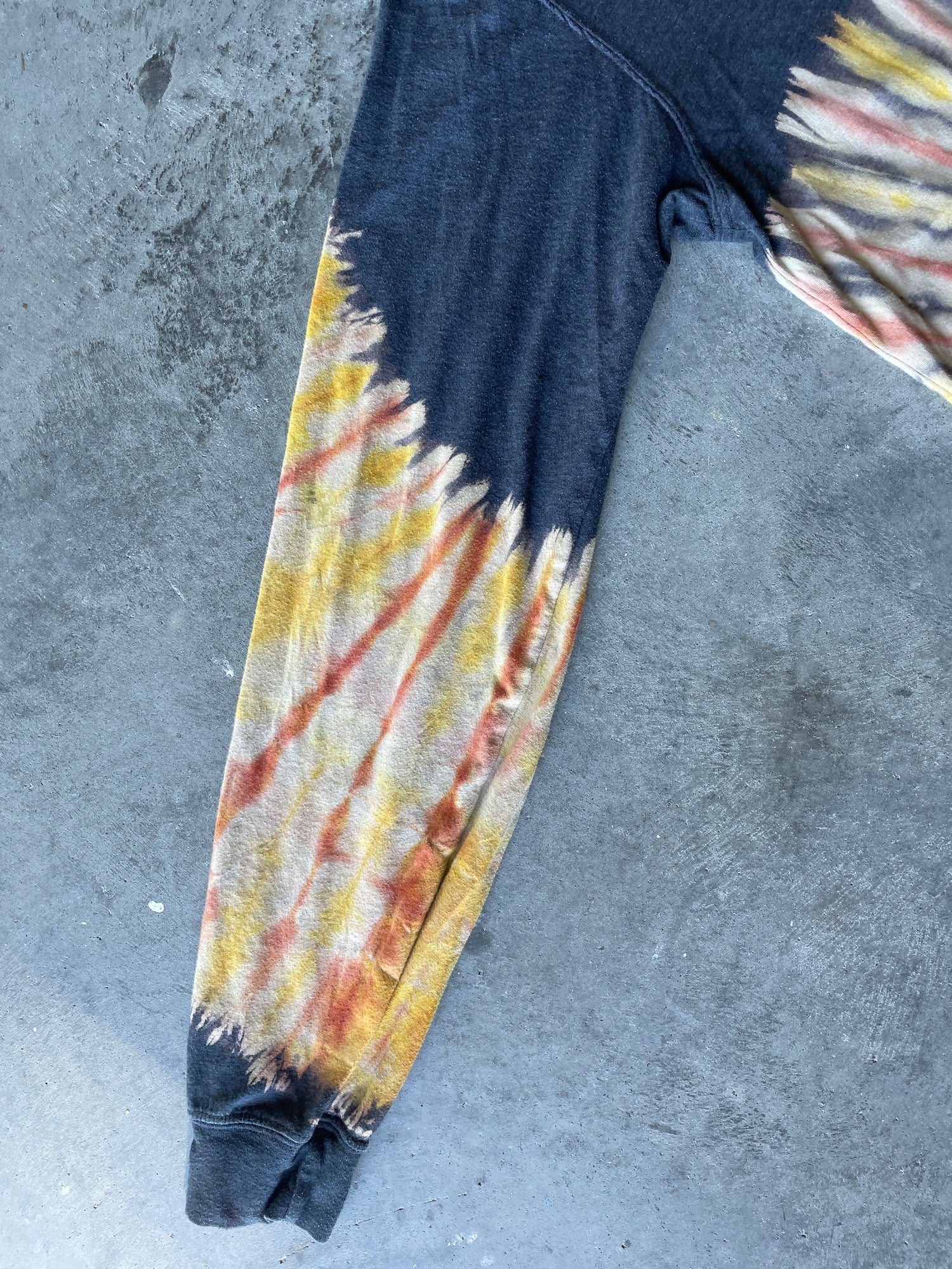 gray t-shirt that's had portions of color removed and re-dyed with shades of orange and yellow spiral tie dye pattern