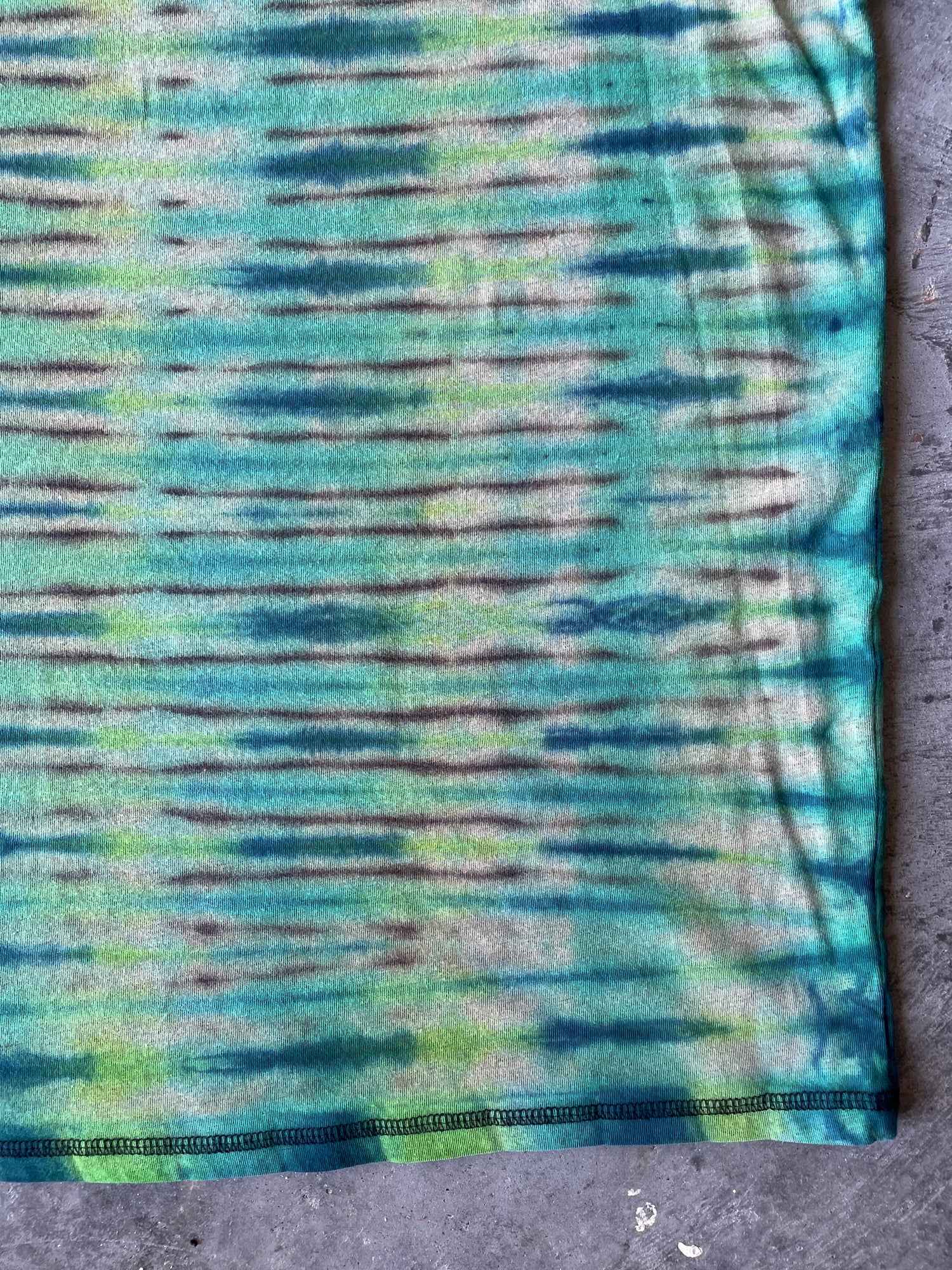 black t-shirt that's had portions of color removed and re-dyed with shades of green half-pleated spiral tie dye pattern
