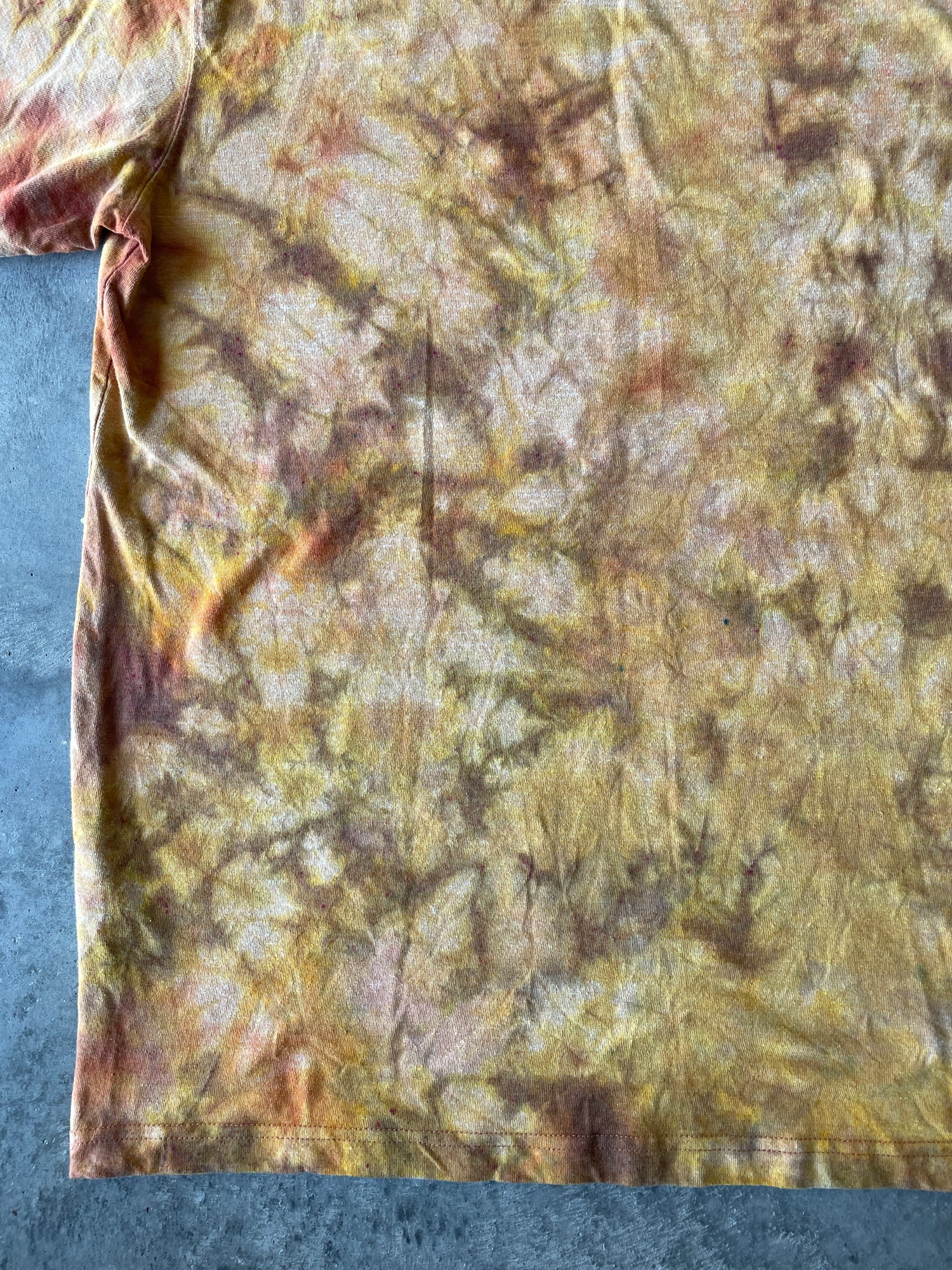 light brown t-shirt dyed with shades of gold crumpled tie dye pattern