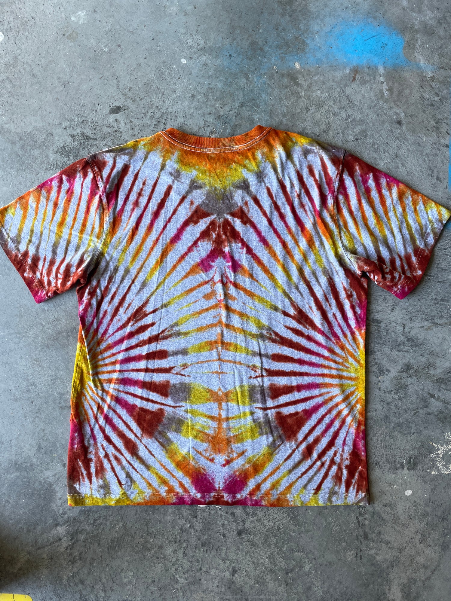 gray t-shirt dyed with shades of orange, yellow, brown, and pink pleated tie dye pattern