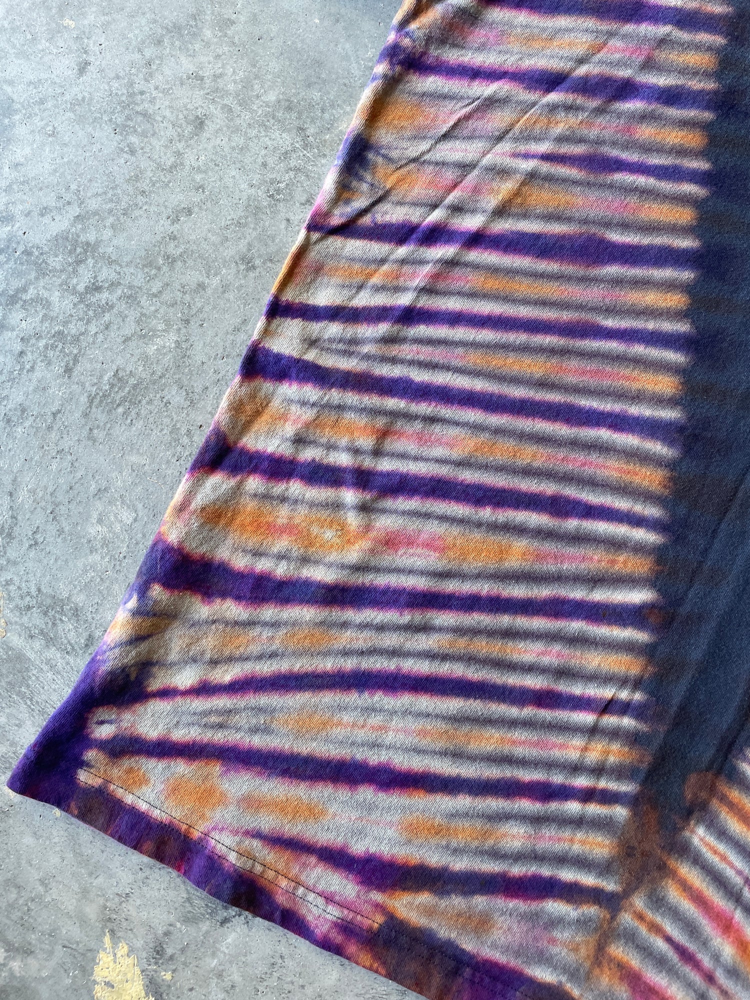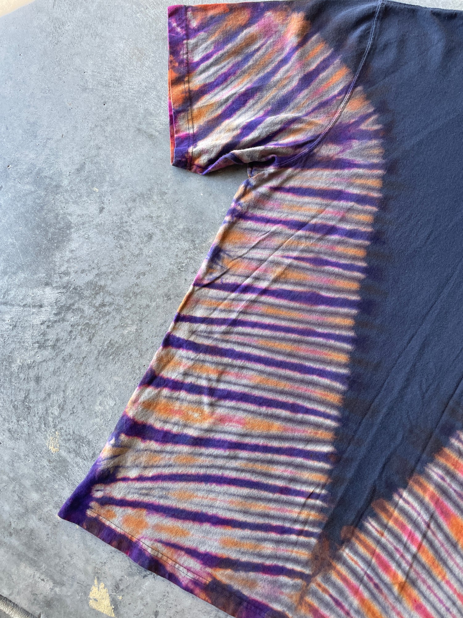 navy blue t-shirt that's had portions of color removed and re-dyed with shades of pink, orange, and purple pleated tie dye pattern