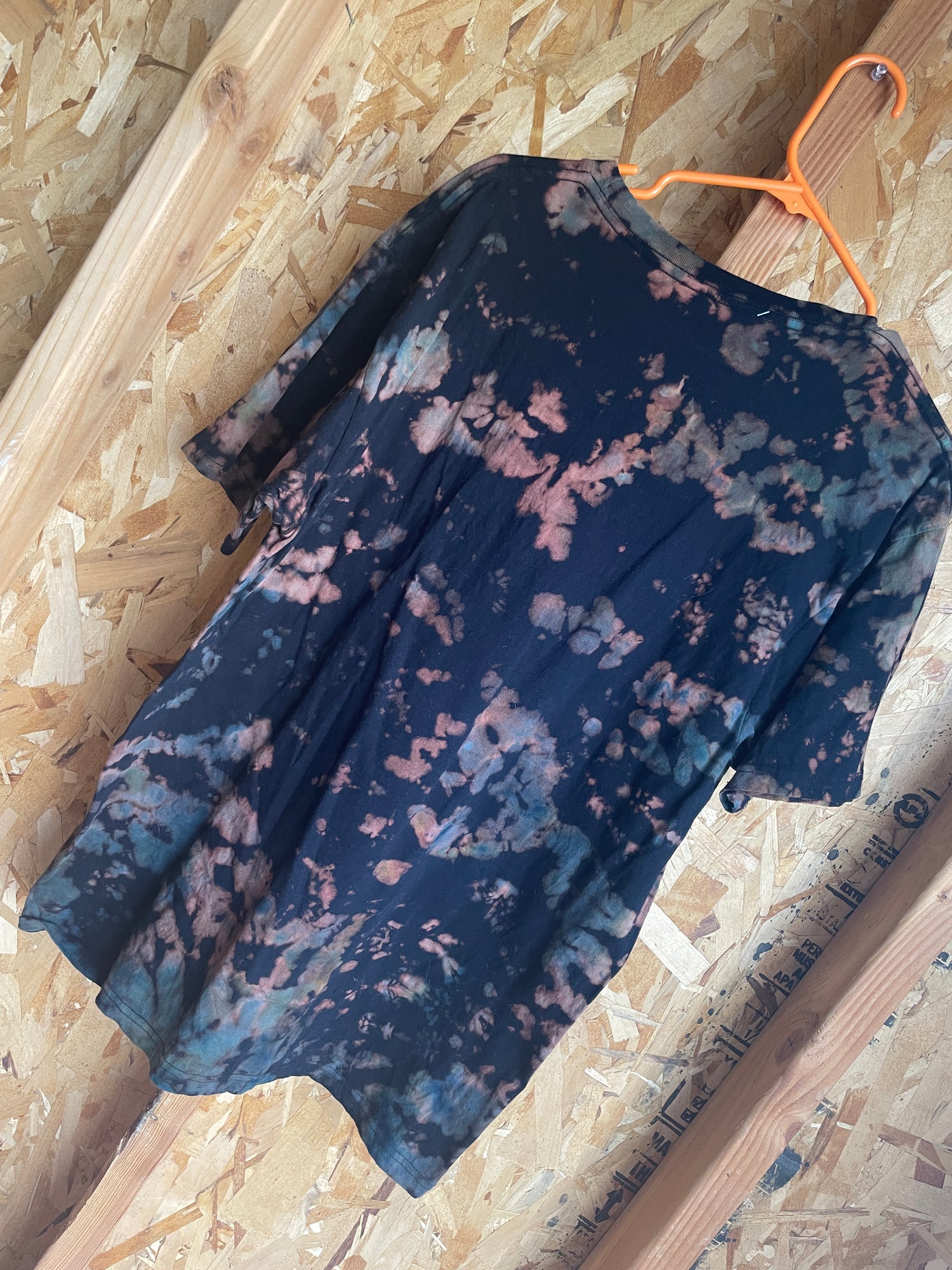 black tshirt dyed with blue and red crumpled tie dye pattern