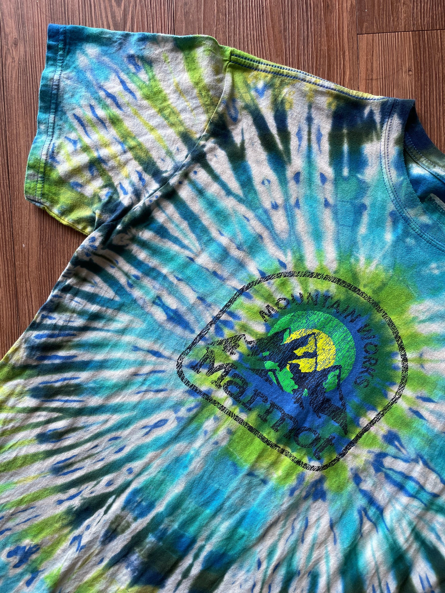 Large Men’s Marmot Mountain Works Handmade Tie Dye T-Shirt | Blue and Green Cool Pleated Bleach Dye Short Sleeve
