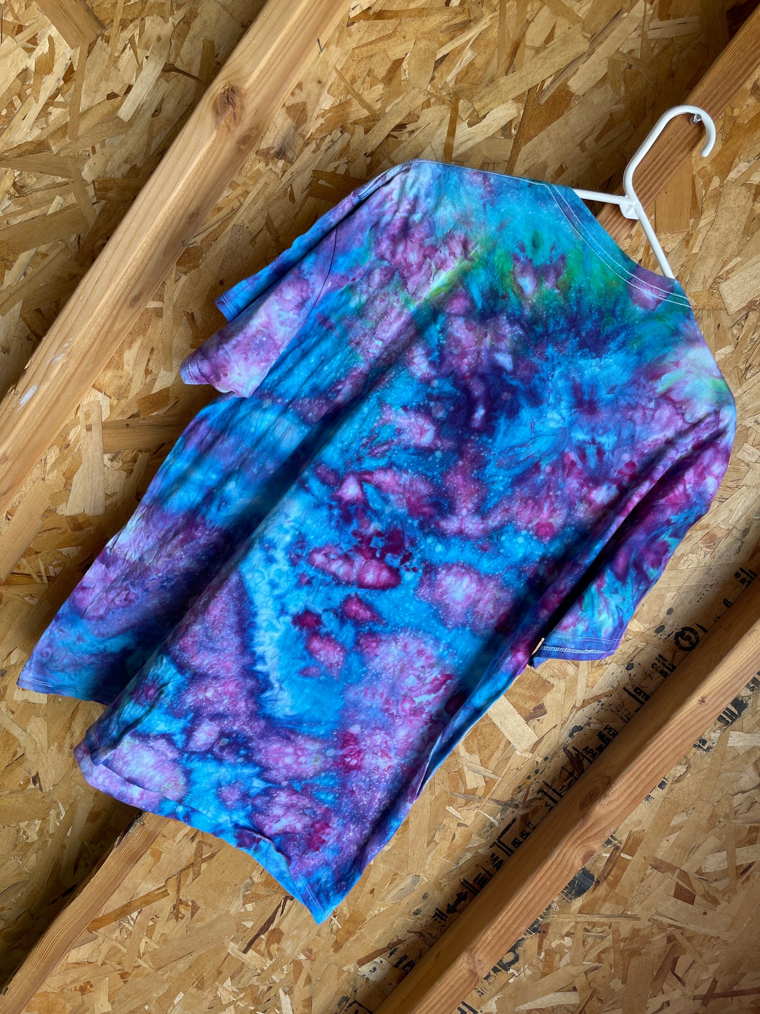 white tshirt dyed with blue, purple, and pink ice dye tie dye pattern