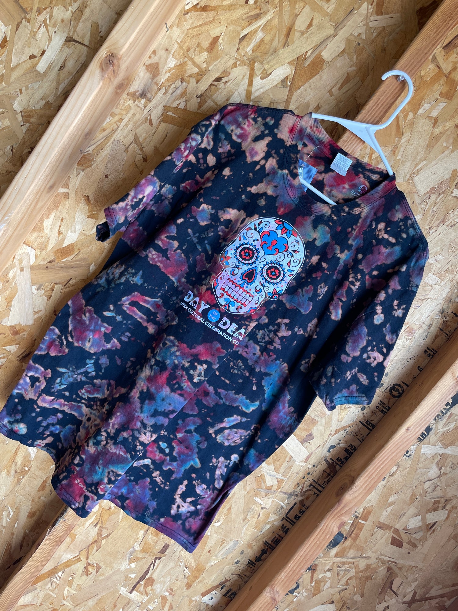XL Men’s Sugar Skull Day of the Dead Handmade Tie Dye T-Shirt | Black, Red, and Purple Crumpled Tie Dye Short Sleeve