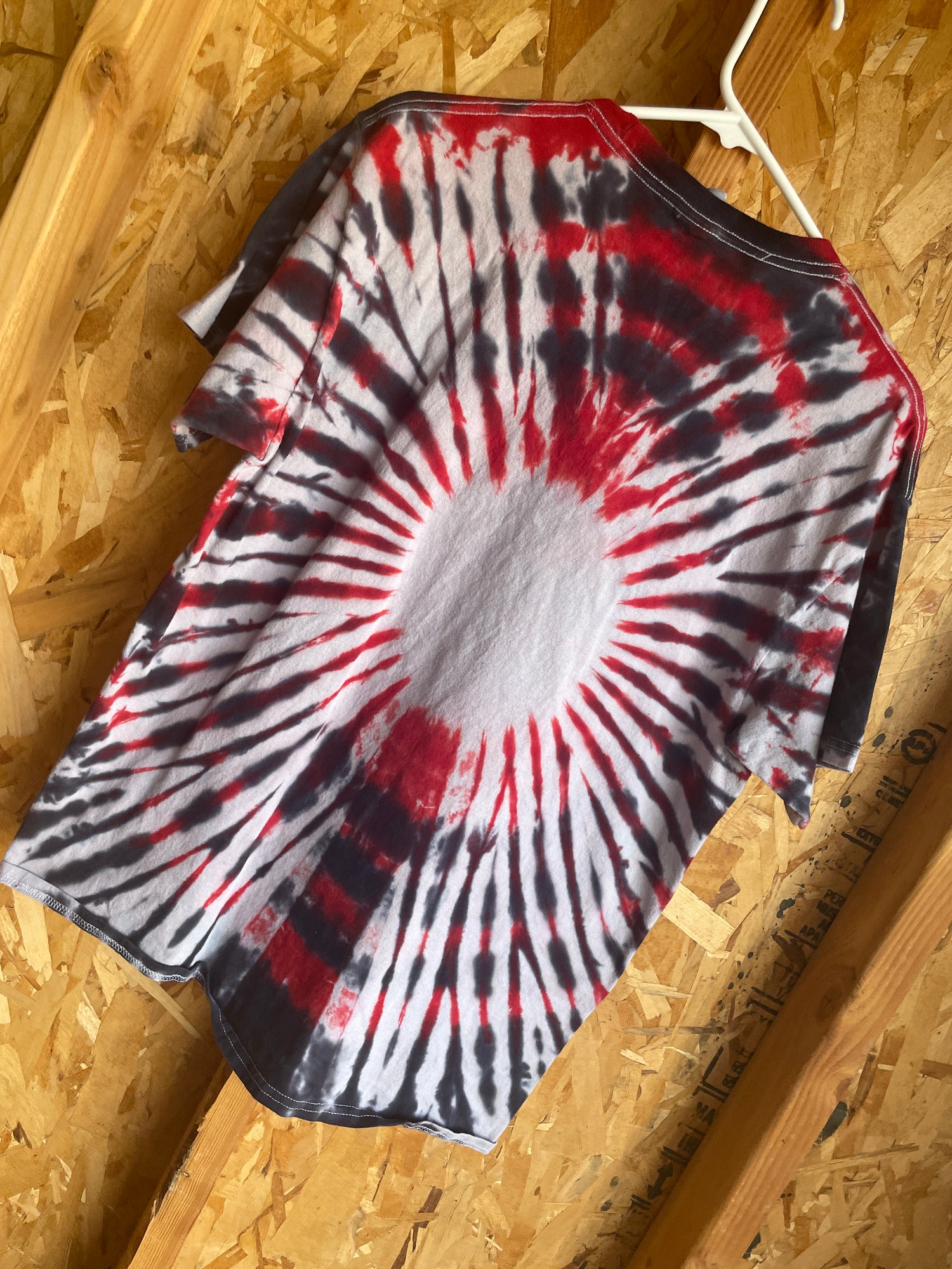 gray tshirt dyed with red and black pleated tie dye pattern