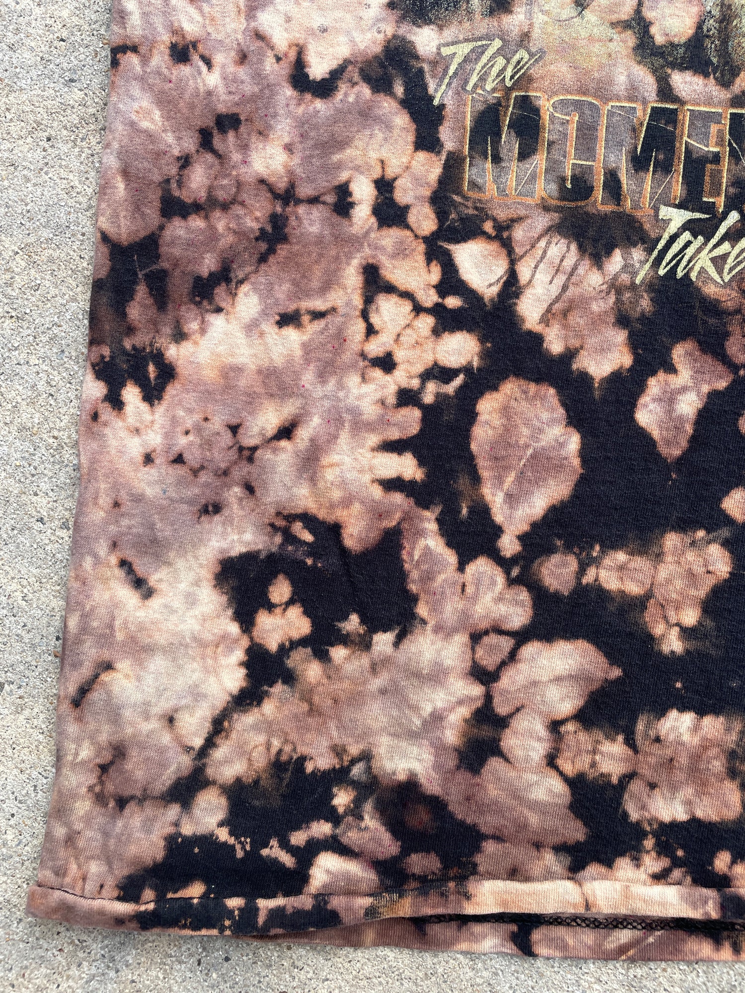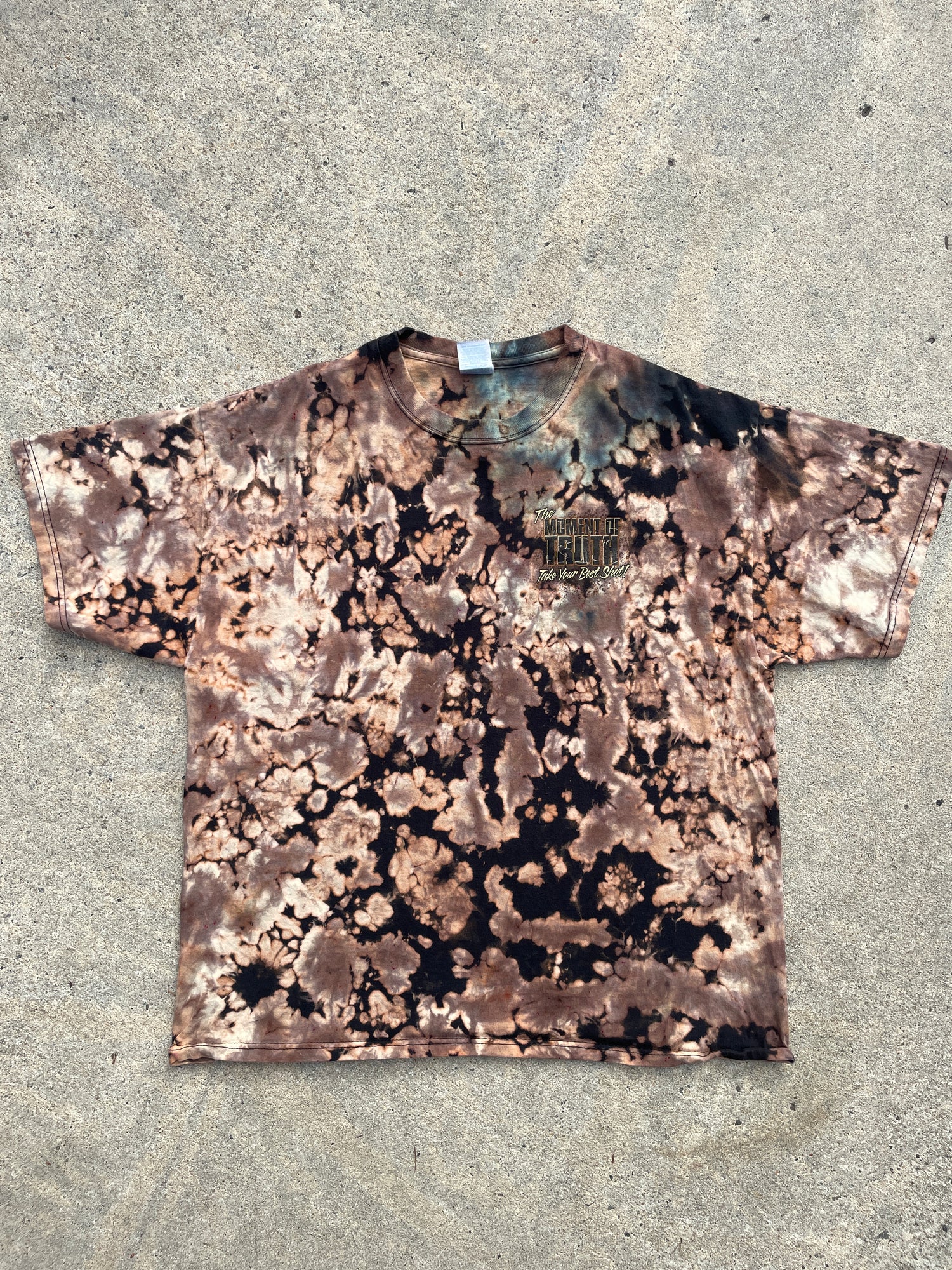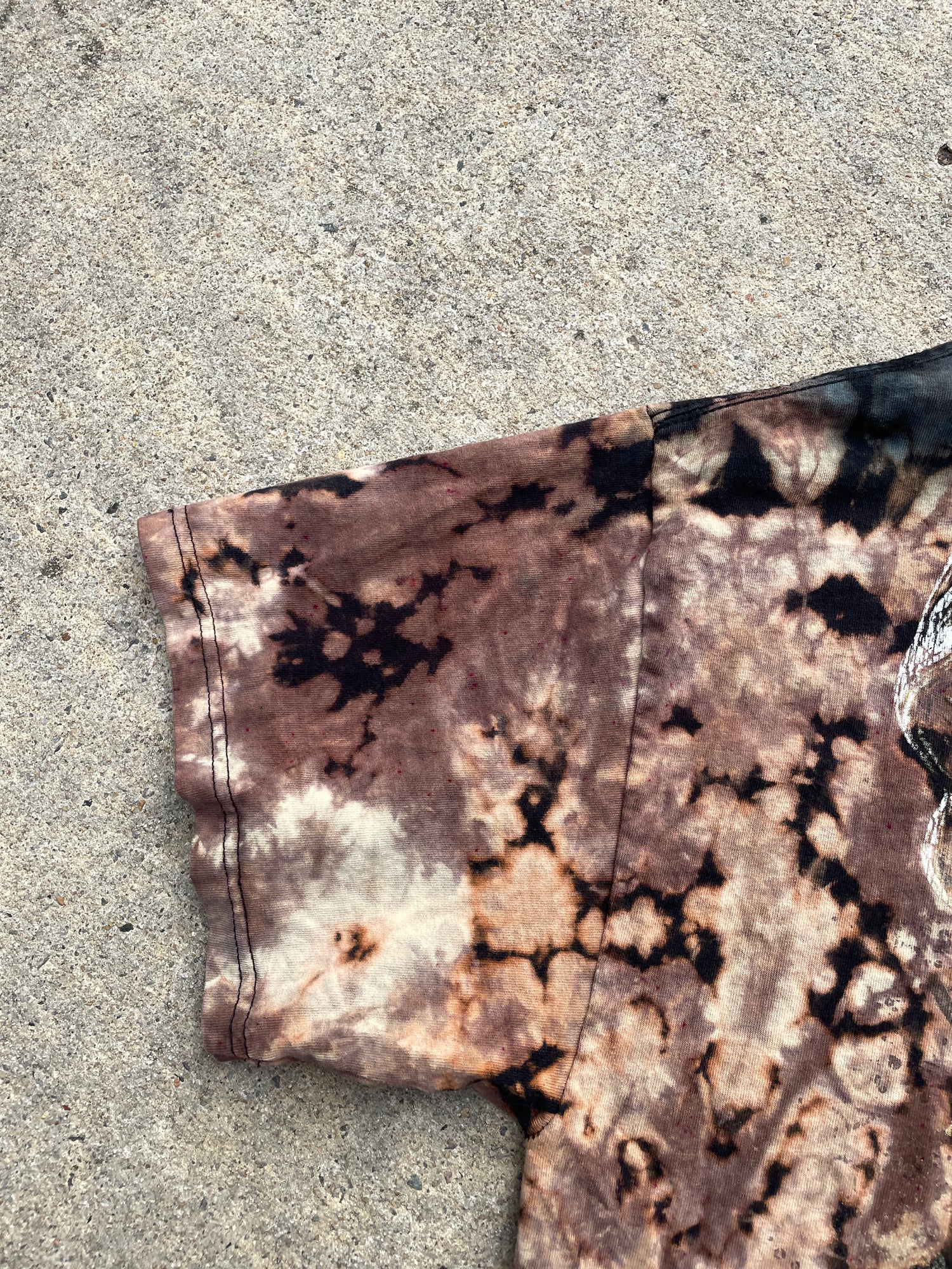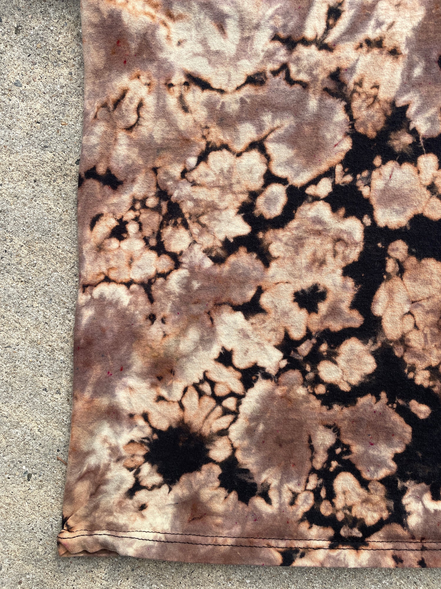 black t-shirt that's had portions of color removed and re-dyed with shades of brown crumpled tie dye pattern