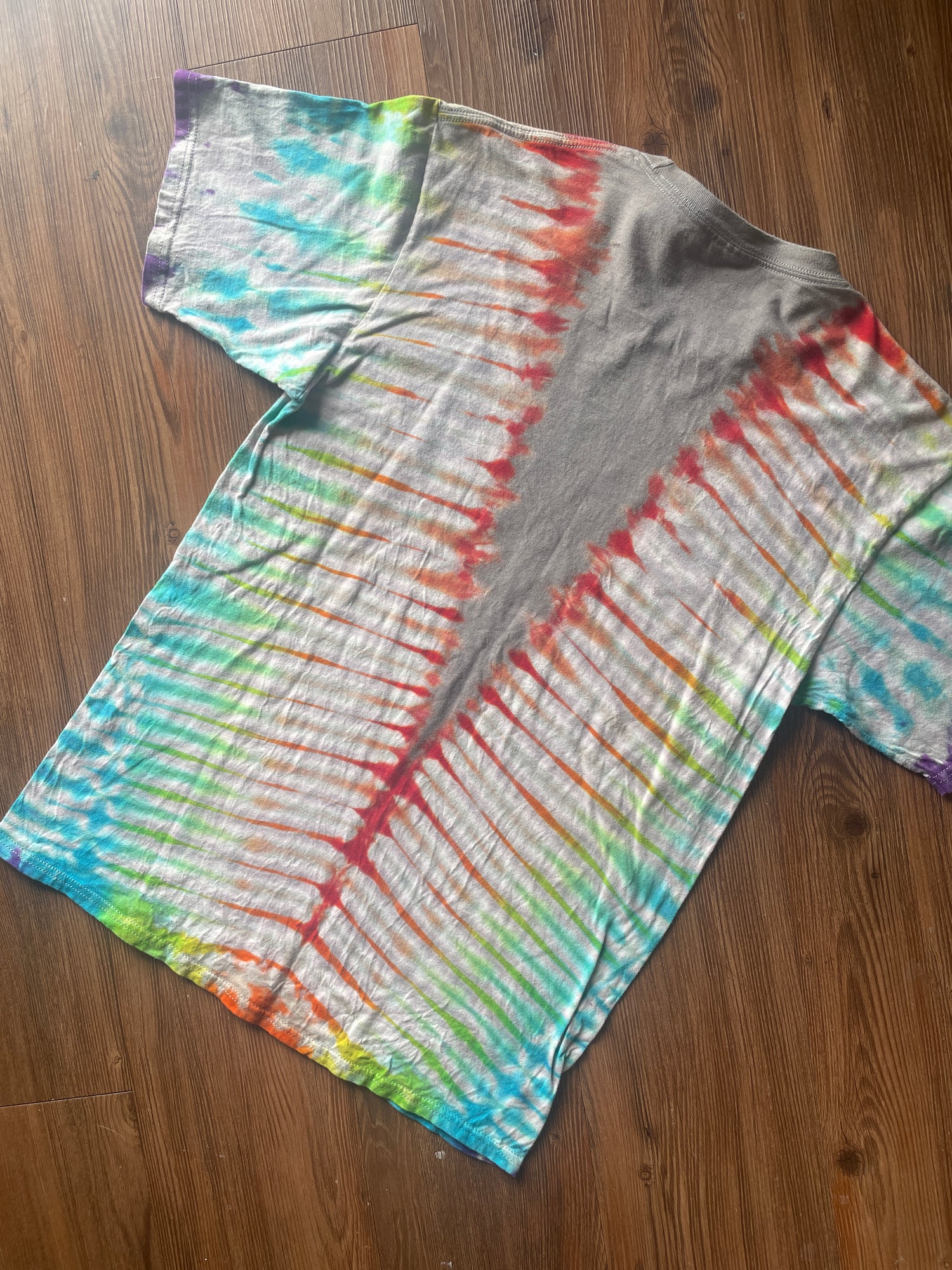 gray tshirt dyed with rainbow pleated tie dye pattern