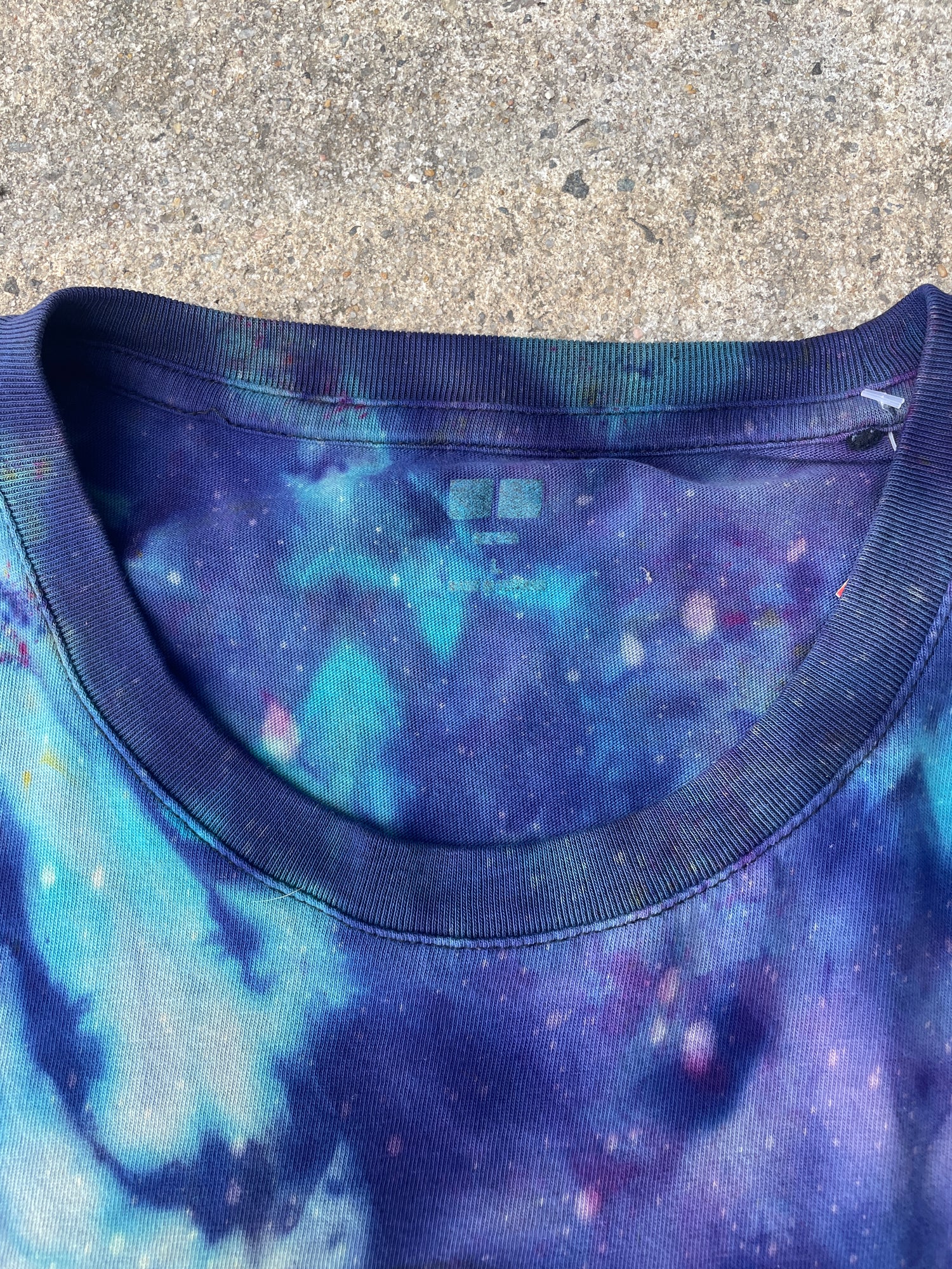 Hand-Printed Alien Purple and Blue Galaxy Dye Short Sleeve T-Shirt | Men's Size Large