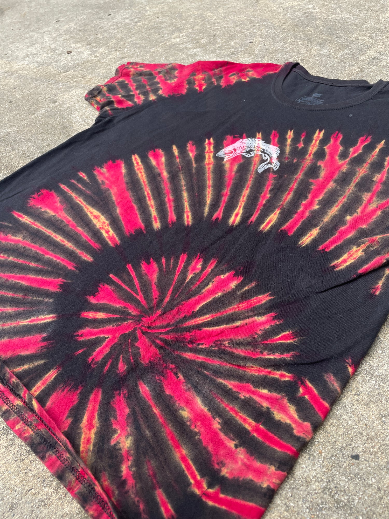 Hand-Printed Largemouth Bass Black and Red Spiral Reverse Tie Dye Short Sleeve T-Shirt | Men's Size XL