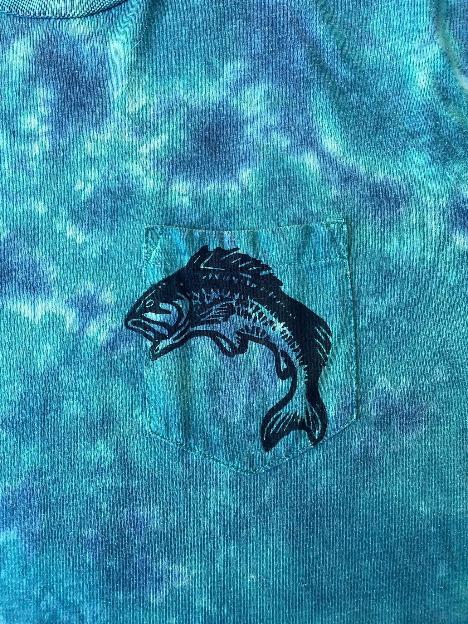 Hand-Printed Largemouth Bass Blue and White Tie Dye Short Sleeve T-Shirt | Men's Size Large