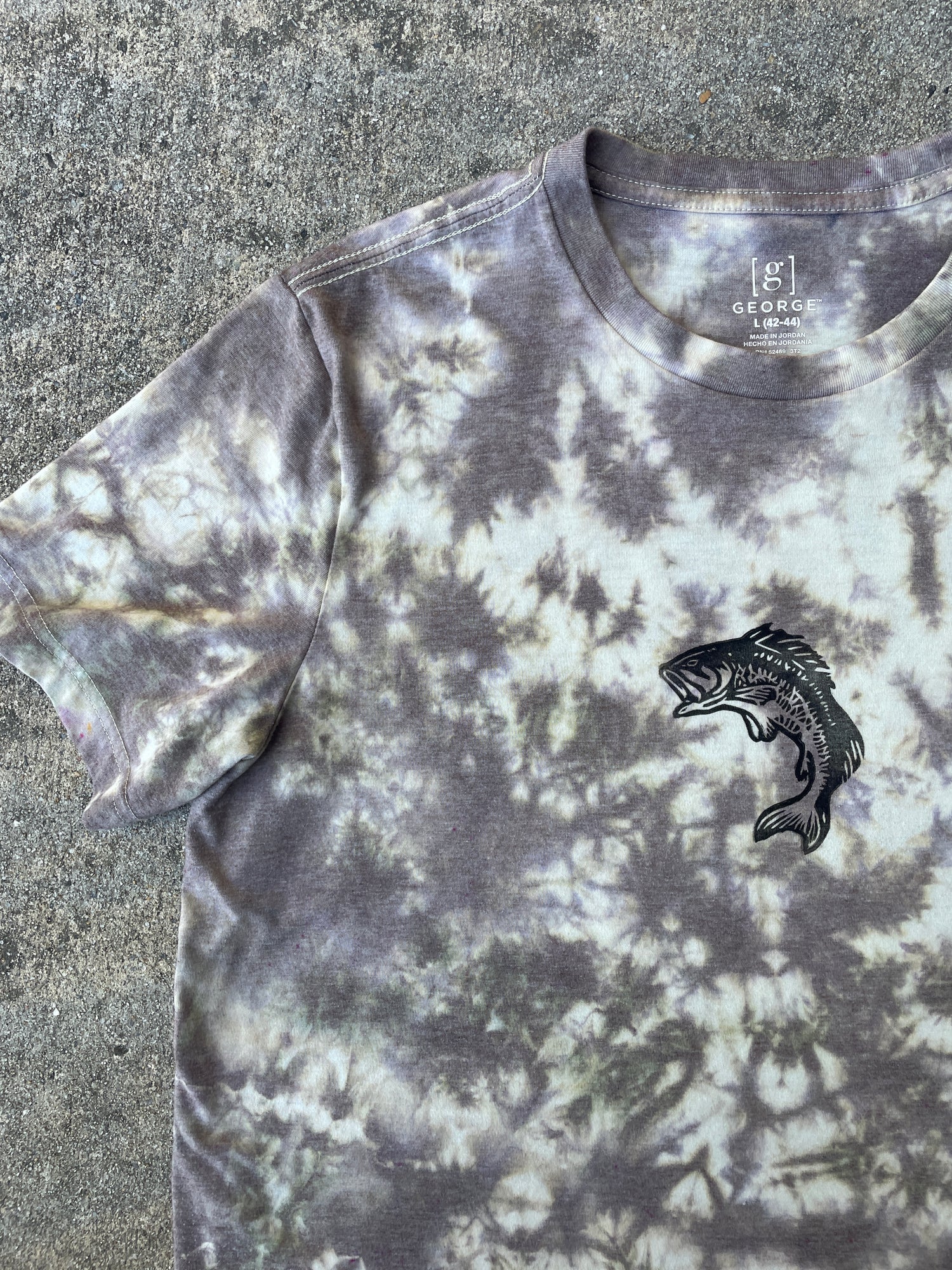 Hand-Printed Largemouth Bass Gray and White Tie Dye Short Sleeve T-Shirt | Men's Size Large
