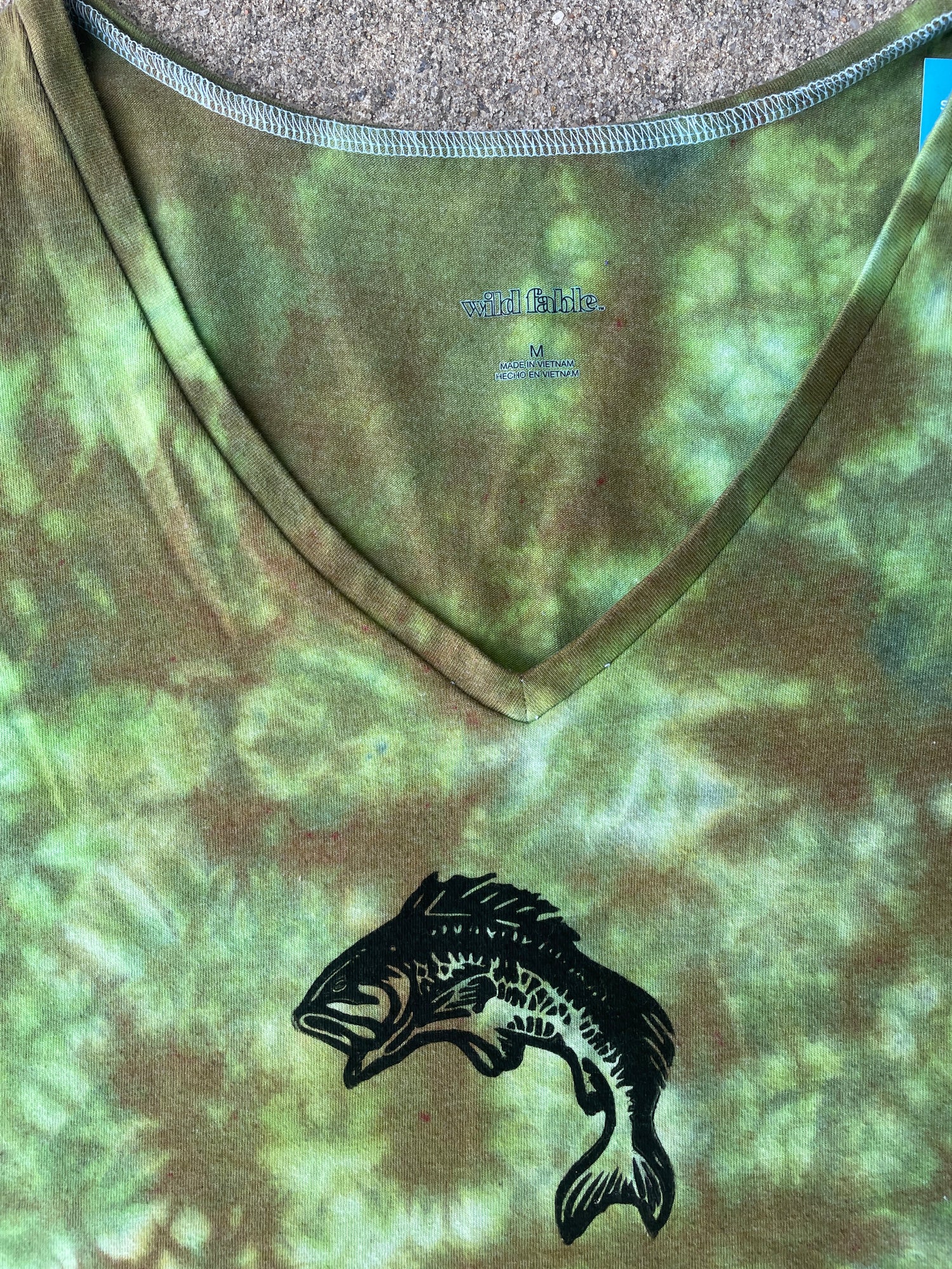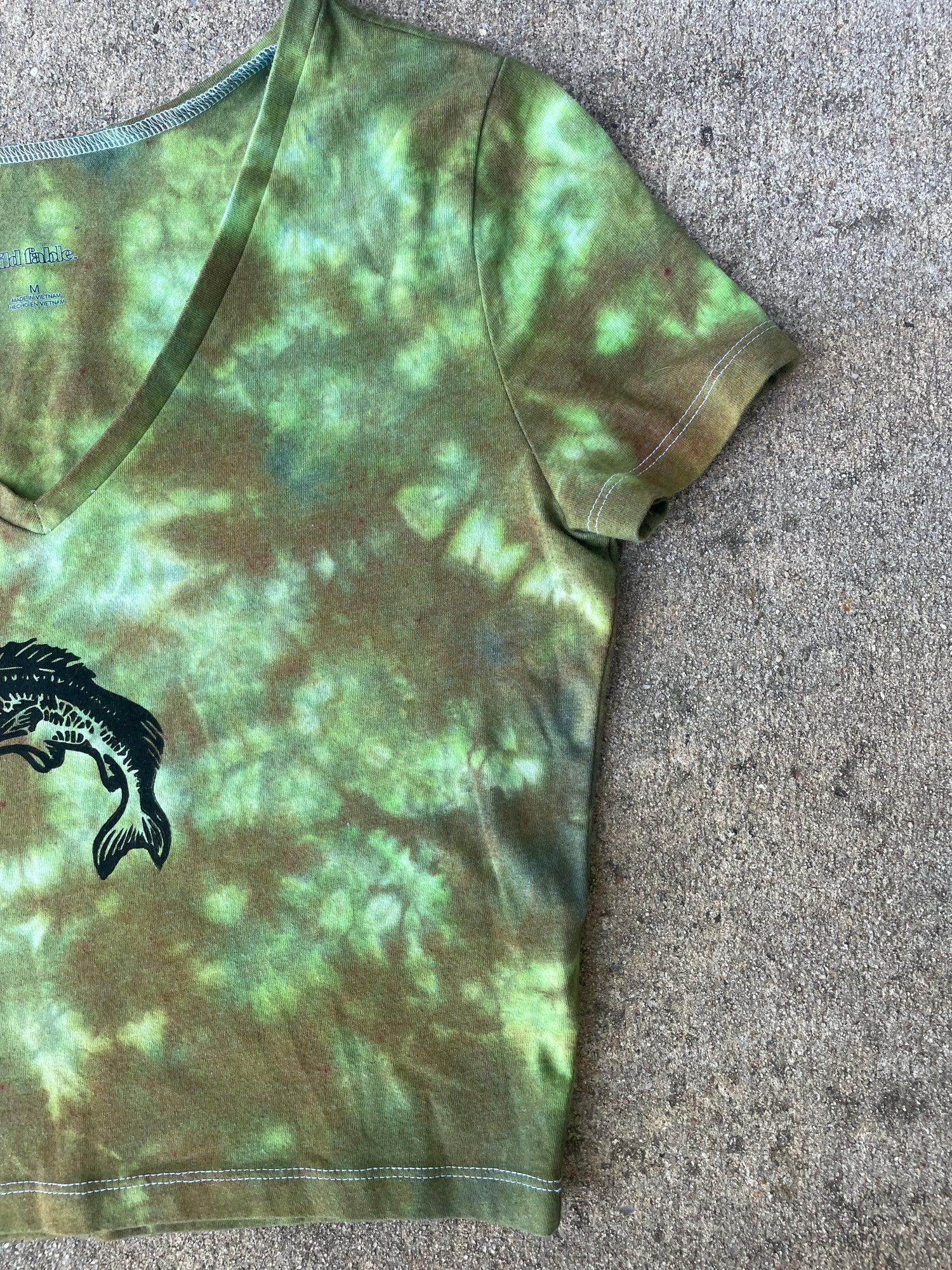 Hand-Printed Largemouth Bass Green and Brown Reverse Tie Dye Crop Top | Women's Size Medium