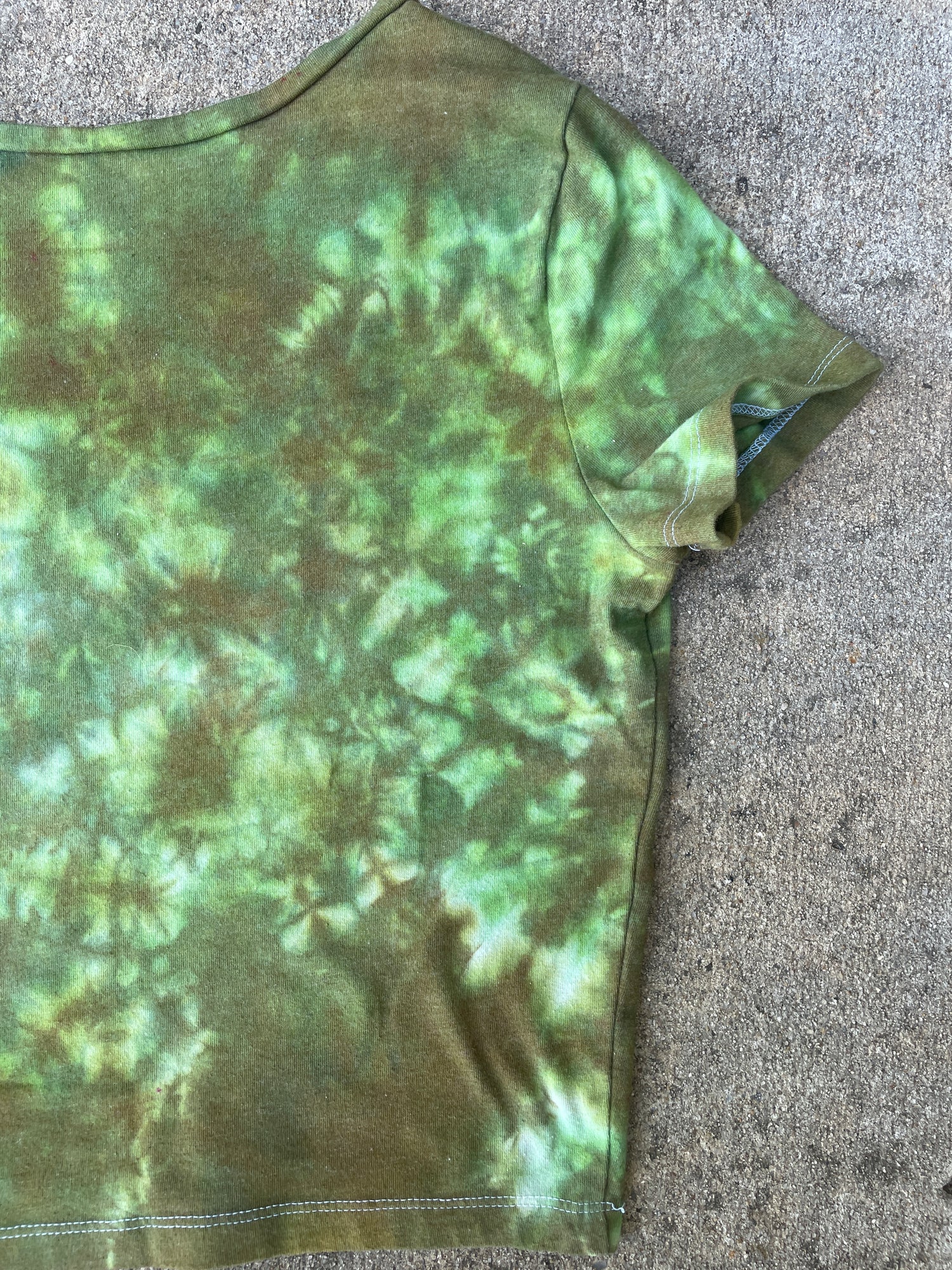 green crop top that's had portions of color removed and re-dyed with green and brown crumpled tie dye pattern
