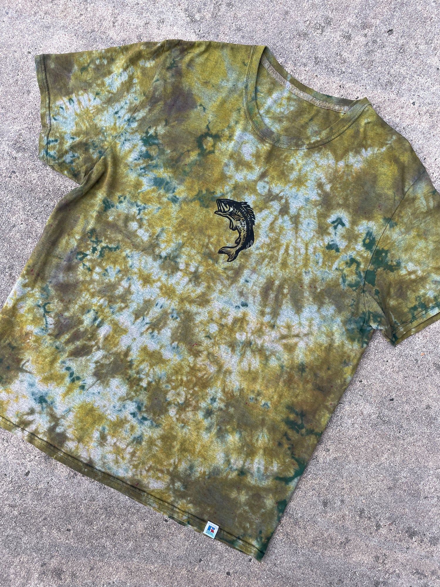 Hand-Printed Largemouth Bass Green and Gray Reverse Tie Dye Short Sleeve T-Shirt | Men's Size XL