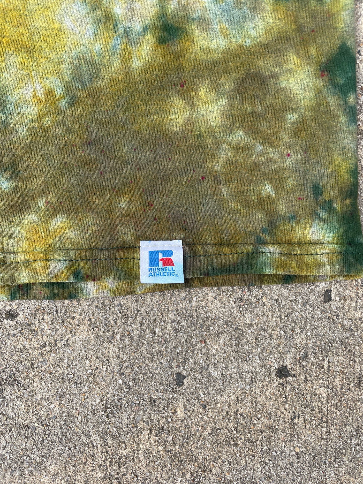 dark green t-shirt that's had portions of color removed and re-dyed with shades of green crumple tie dye pattern