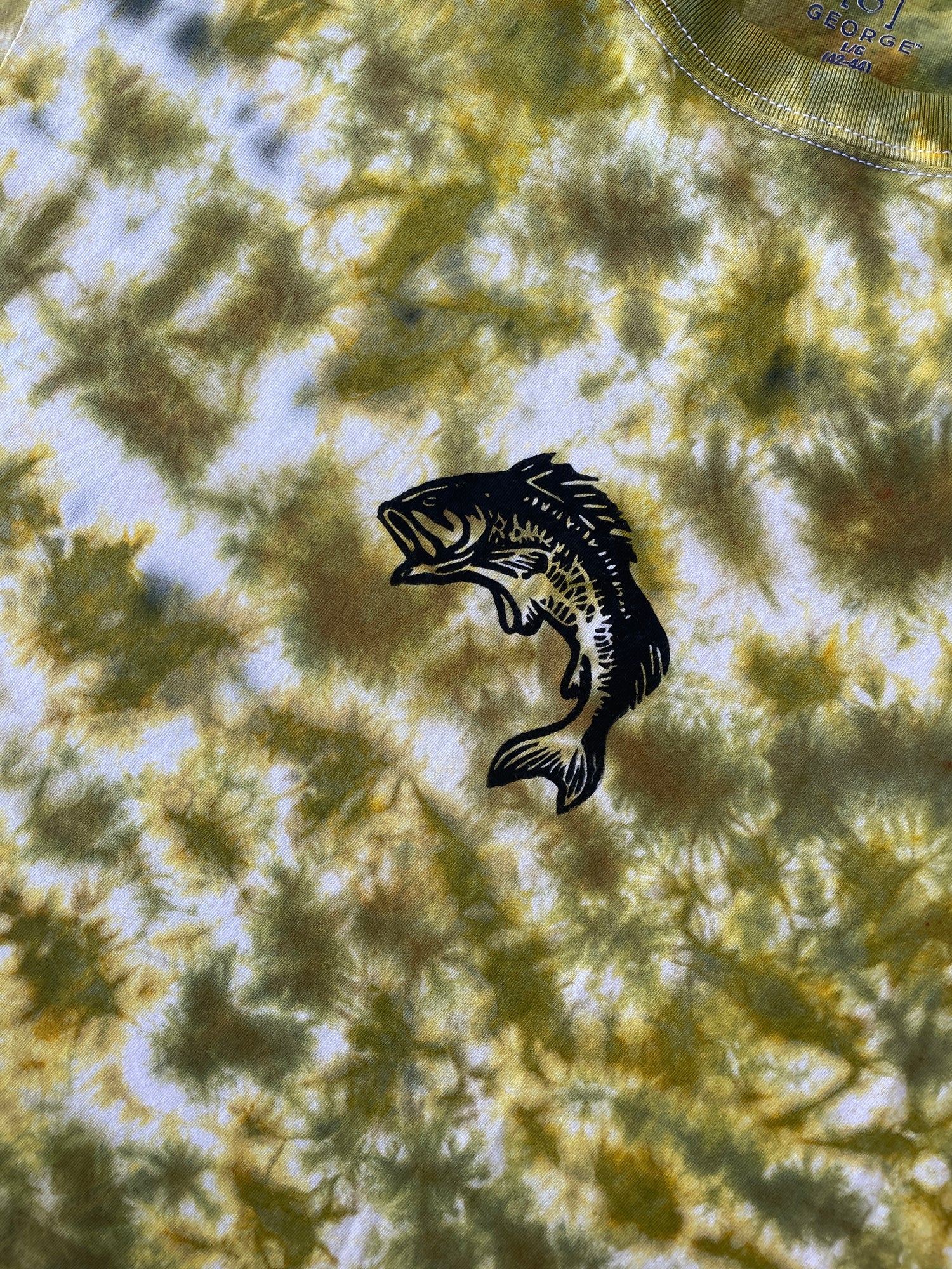 Hand-Printed Largemouth Bass White and Green Tie Dye Short Sleeve T-Shirt | Men's Size Large