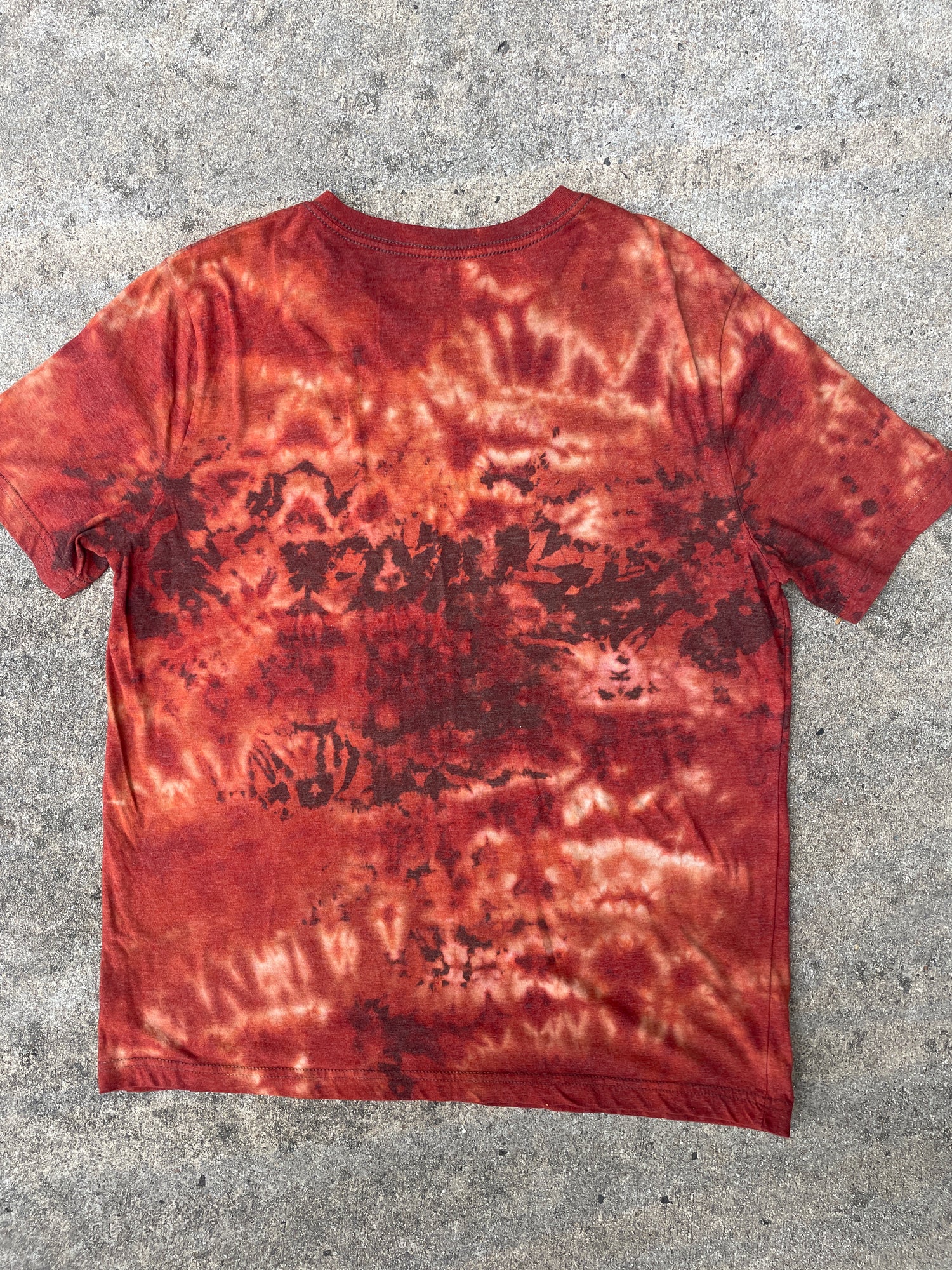brown t-shirt that's had portions of color removed and re-dyed with shades of red and orange crumple tie dye pattern