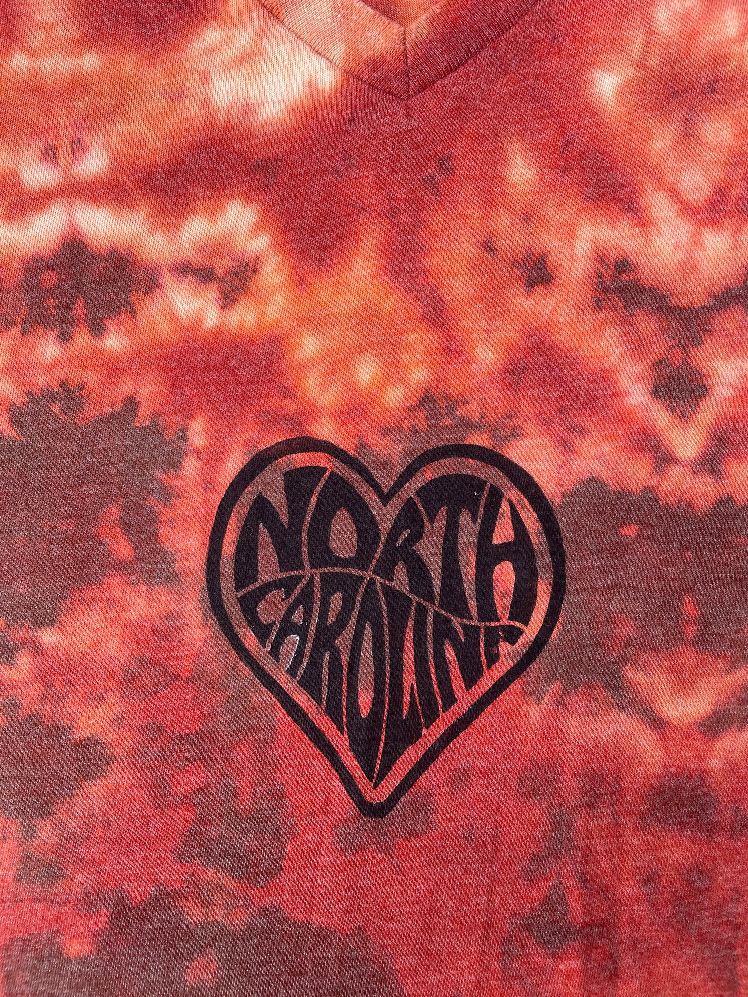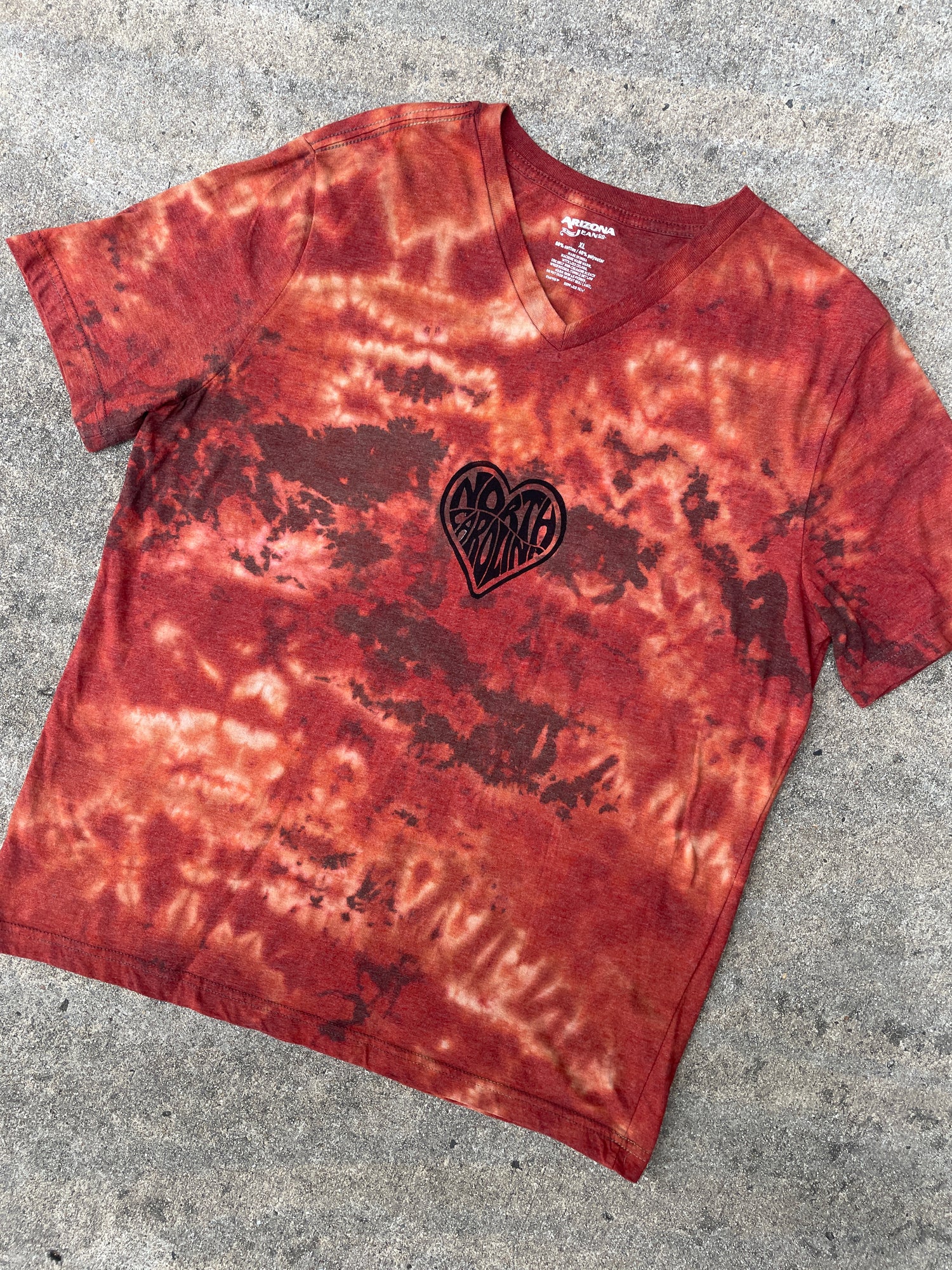 Hand-Printed North Carolina Brown and Orange Reverse Tie Dye Short Sleeve V-Neck T-Shirt | Men's Size XL