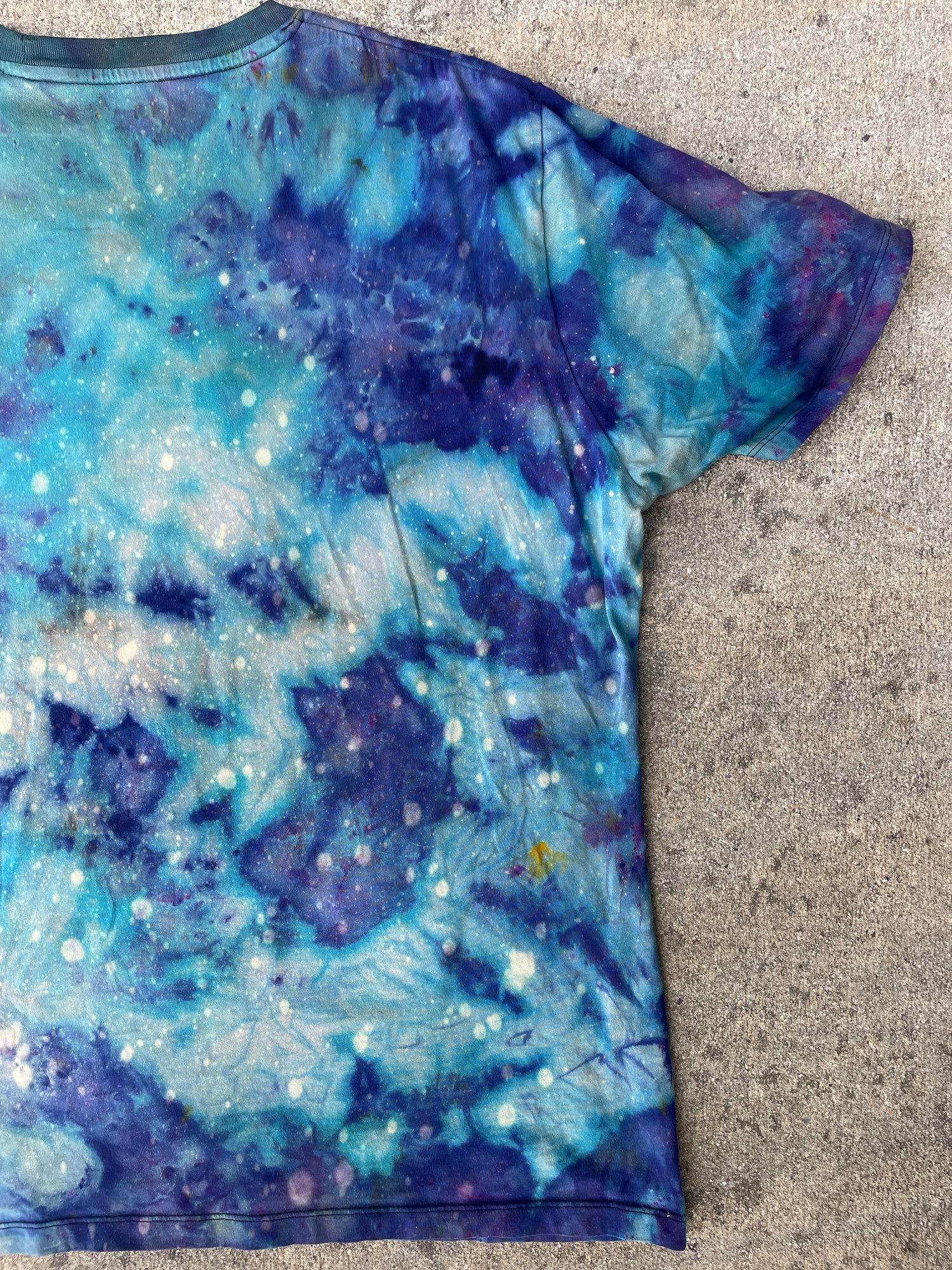 black t-shirt that's had portions of color removed and re-dyed with shades of blue and purple "galaxy" tie dye pattern