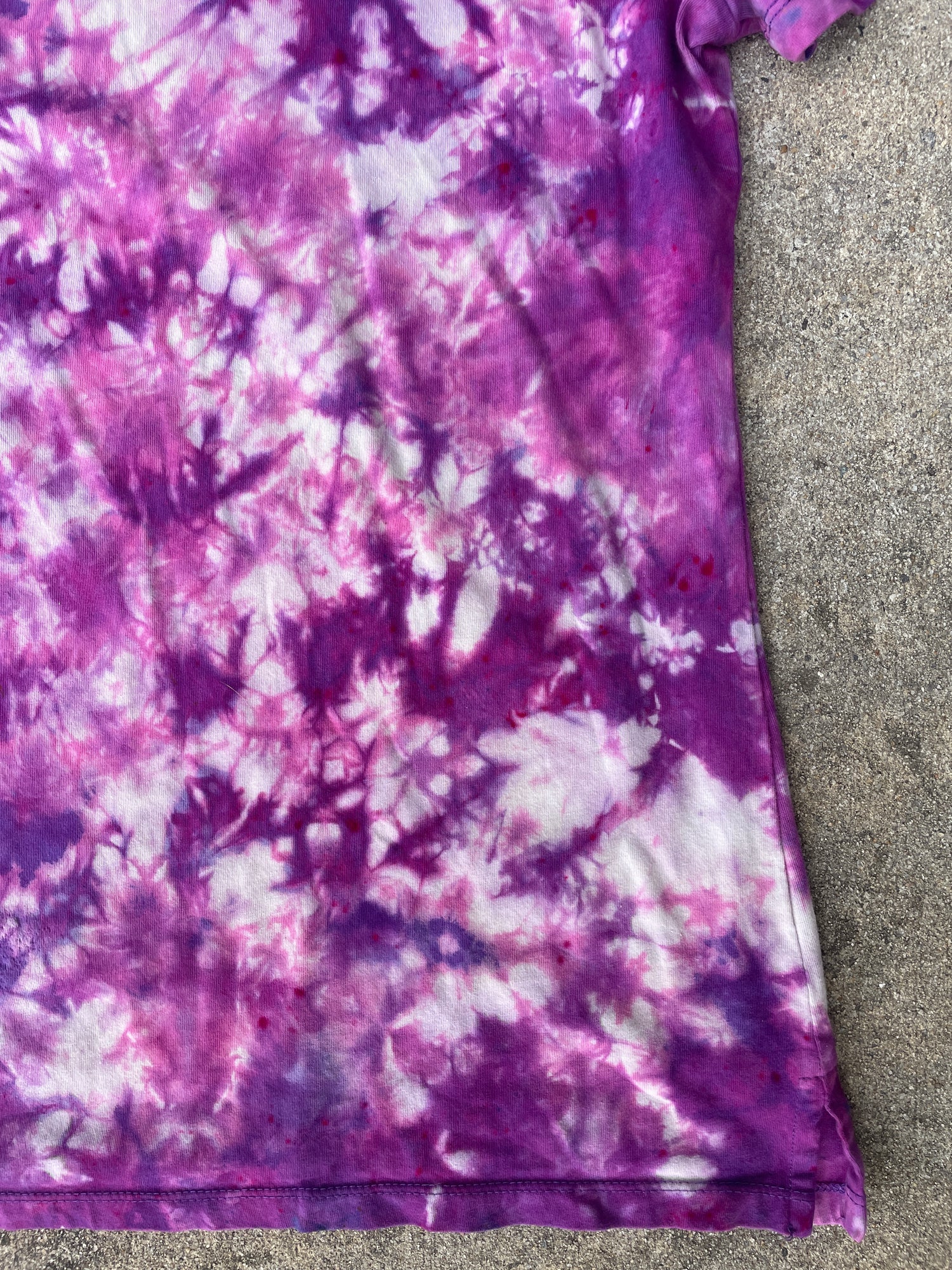 white t-shirt dyed with shades of pink and purple crumpled tie dye pattern