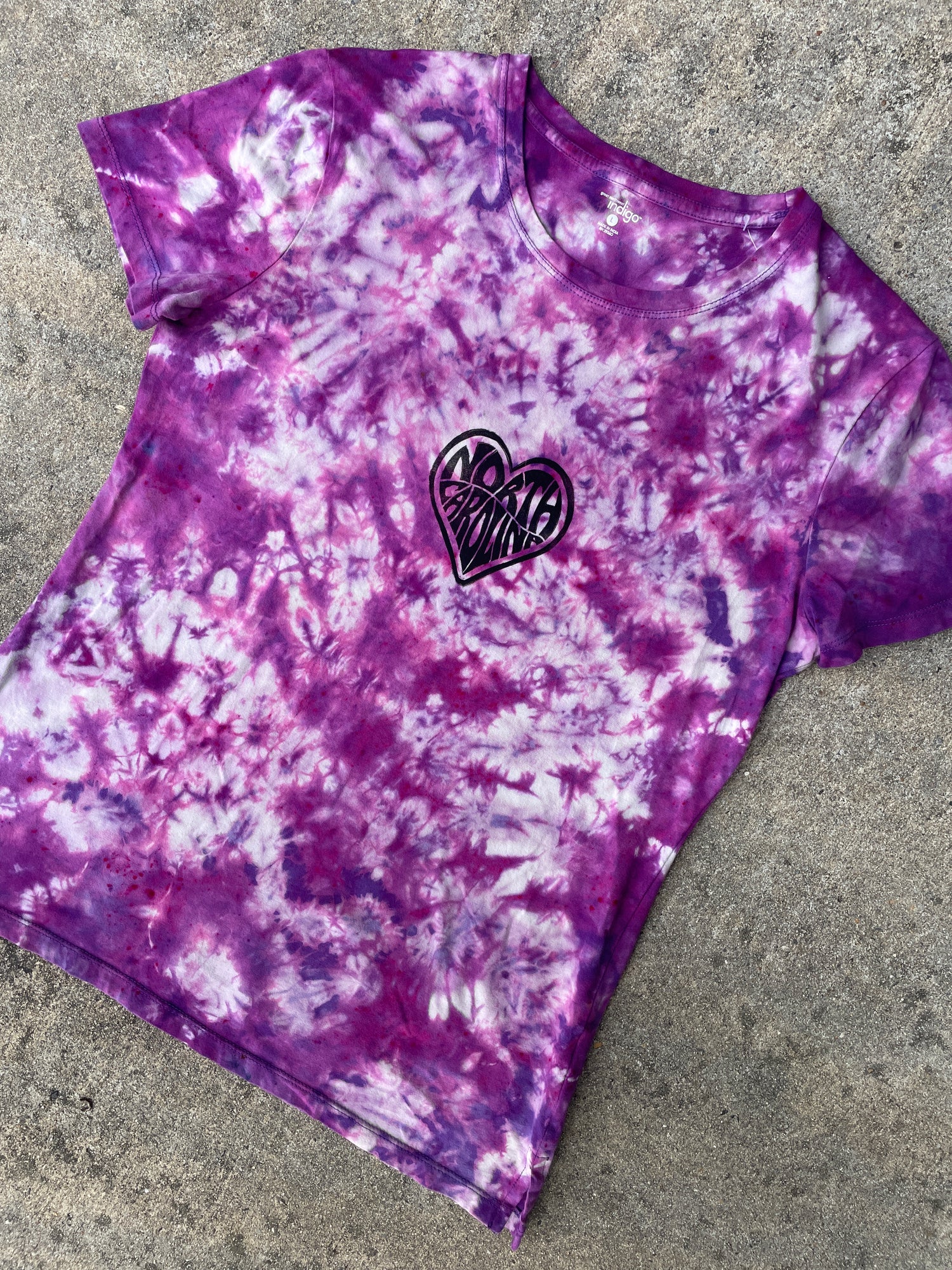 Hand-Printed North Carolina White and Purple Tie Dye Short Sleeve T-Shirt | Women's Size Large
