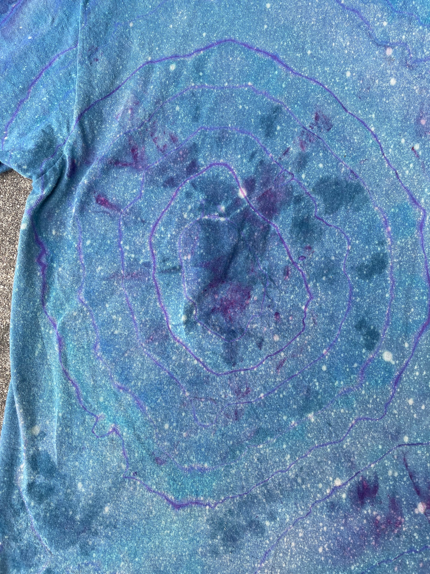 purple t-shirt that's had portions of color removed and re-dyed with shades of blue geode tie dye pattern