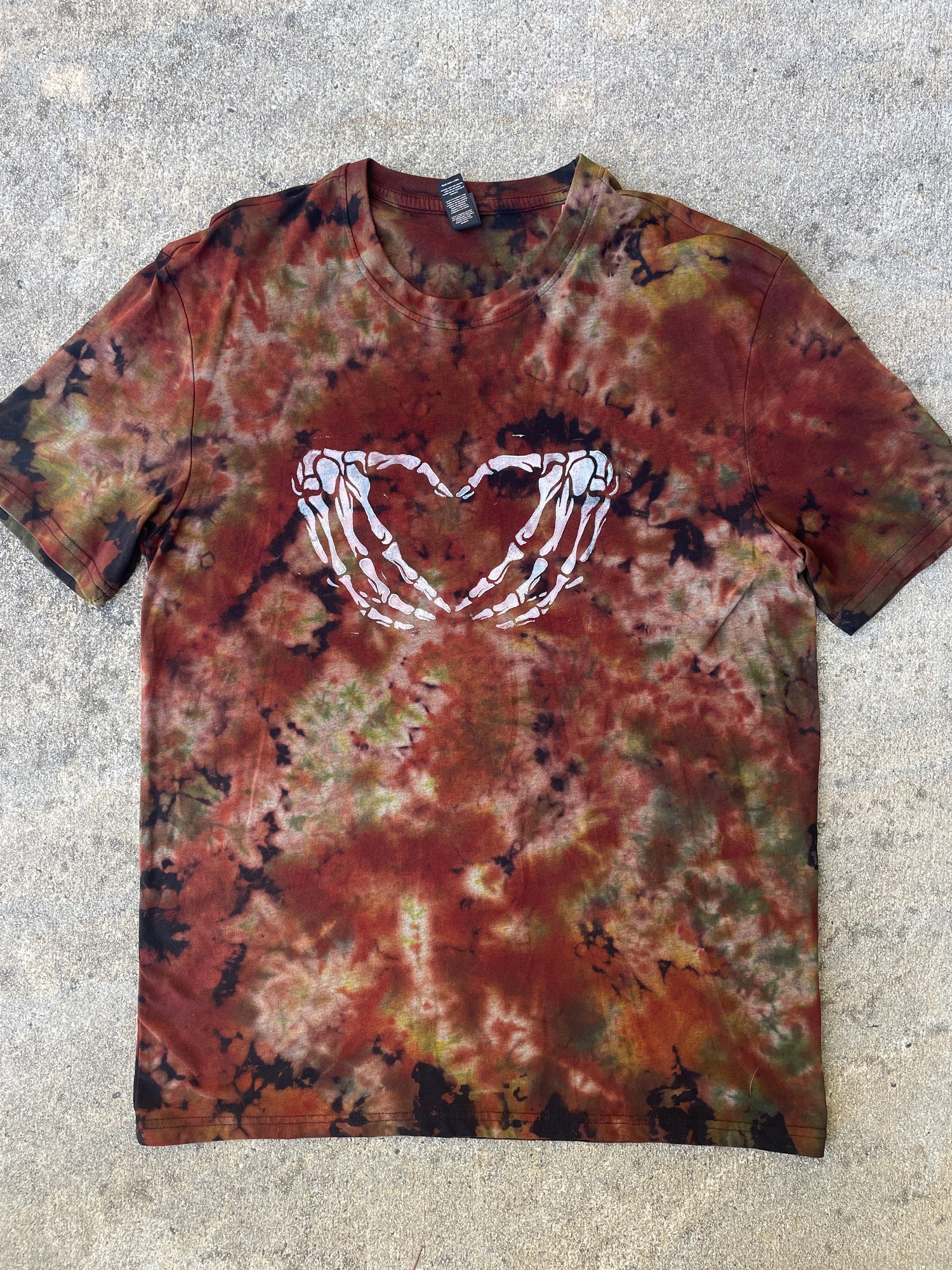 Hand-Printed Skeleton Heart Hands Black and Brown Reverse Tie Dye Short Sleeve T-Shirt | Men's Size Large
