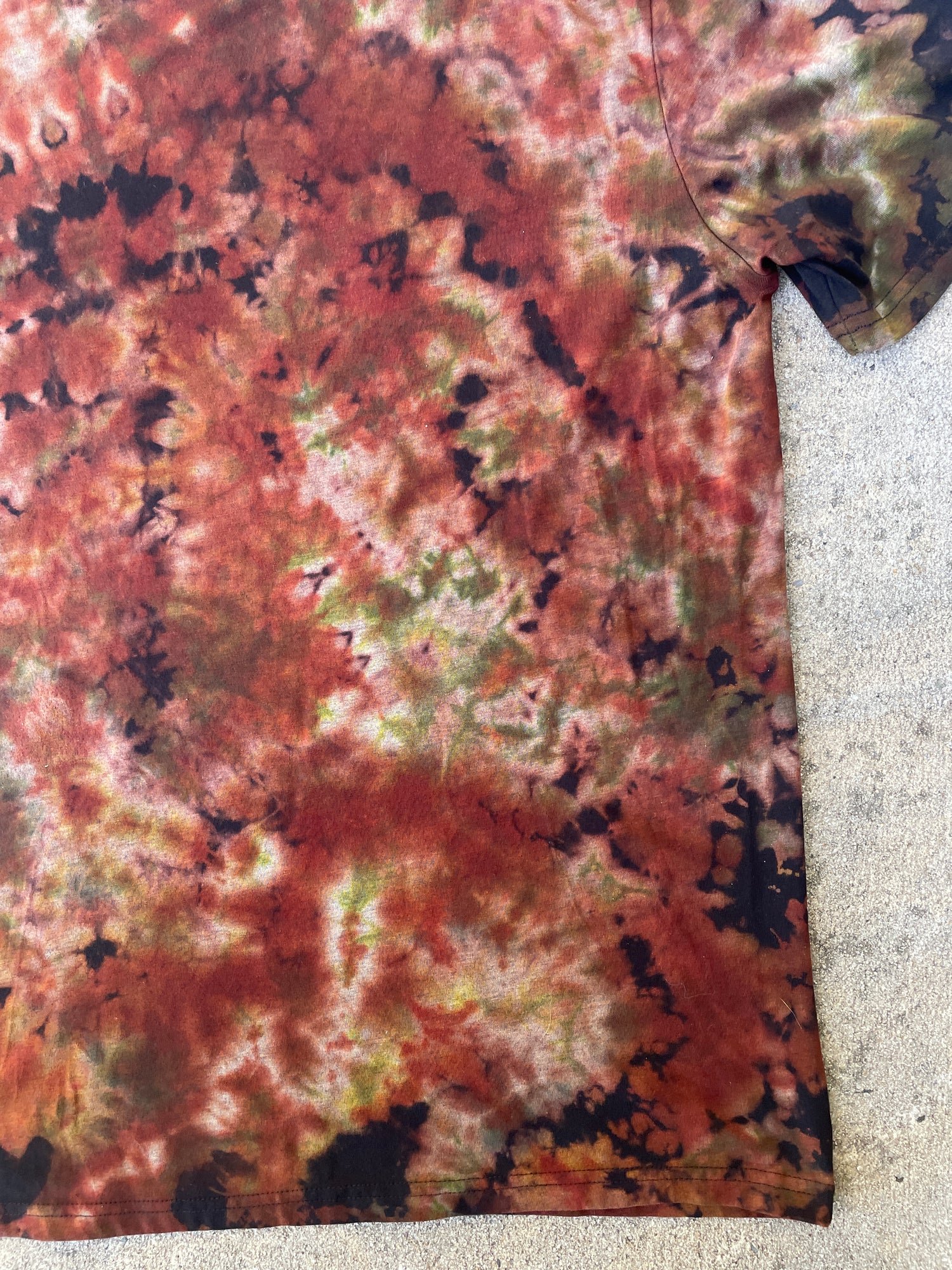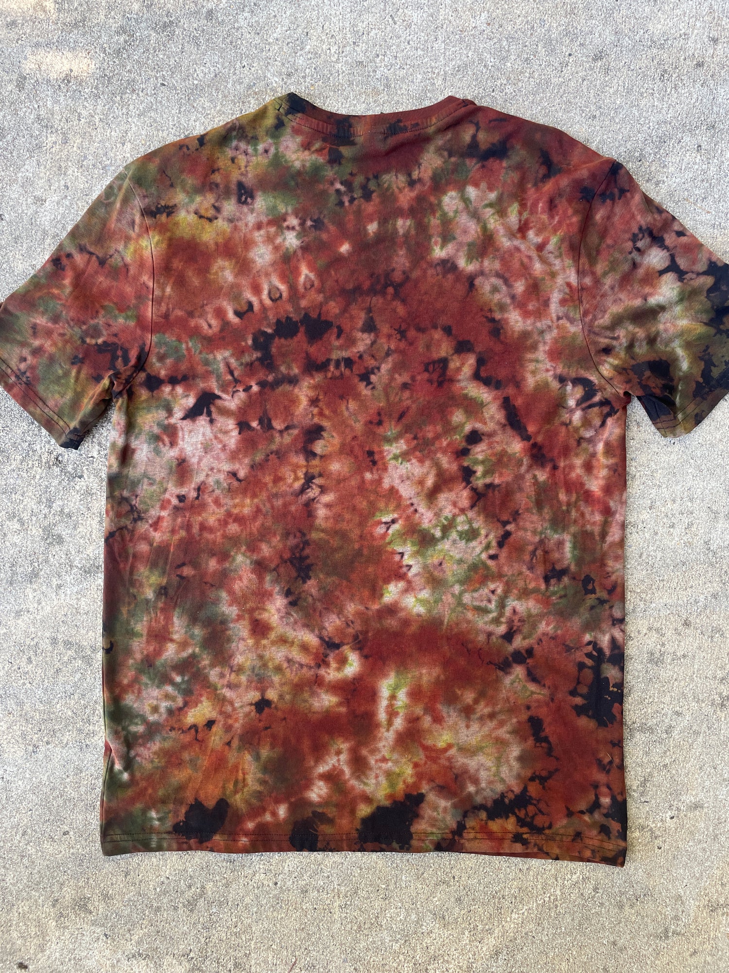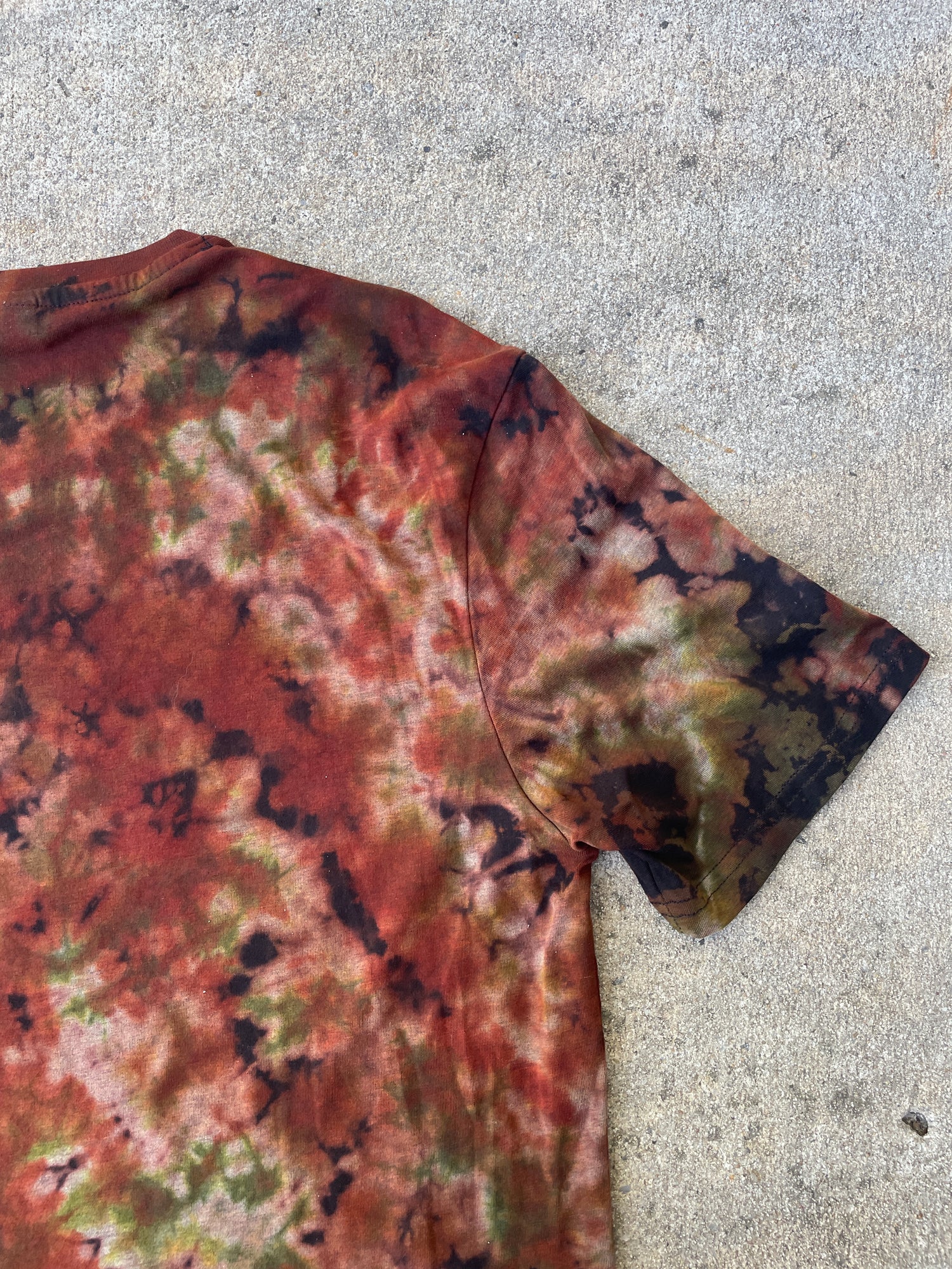 black t-shirt that's had portion of color removed and re-dyed with shades of brown and green crumpled tie dye pattern