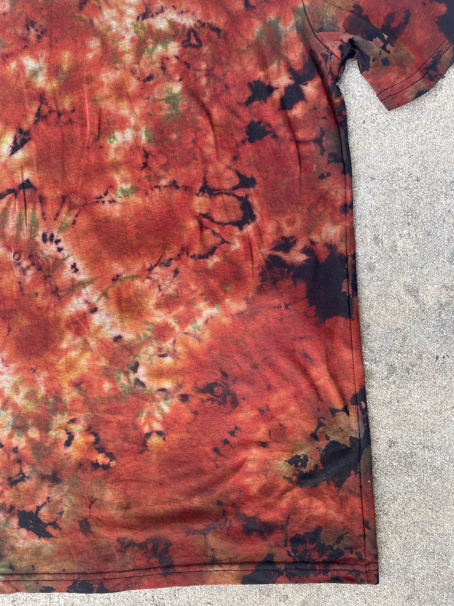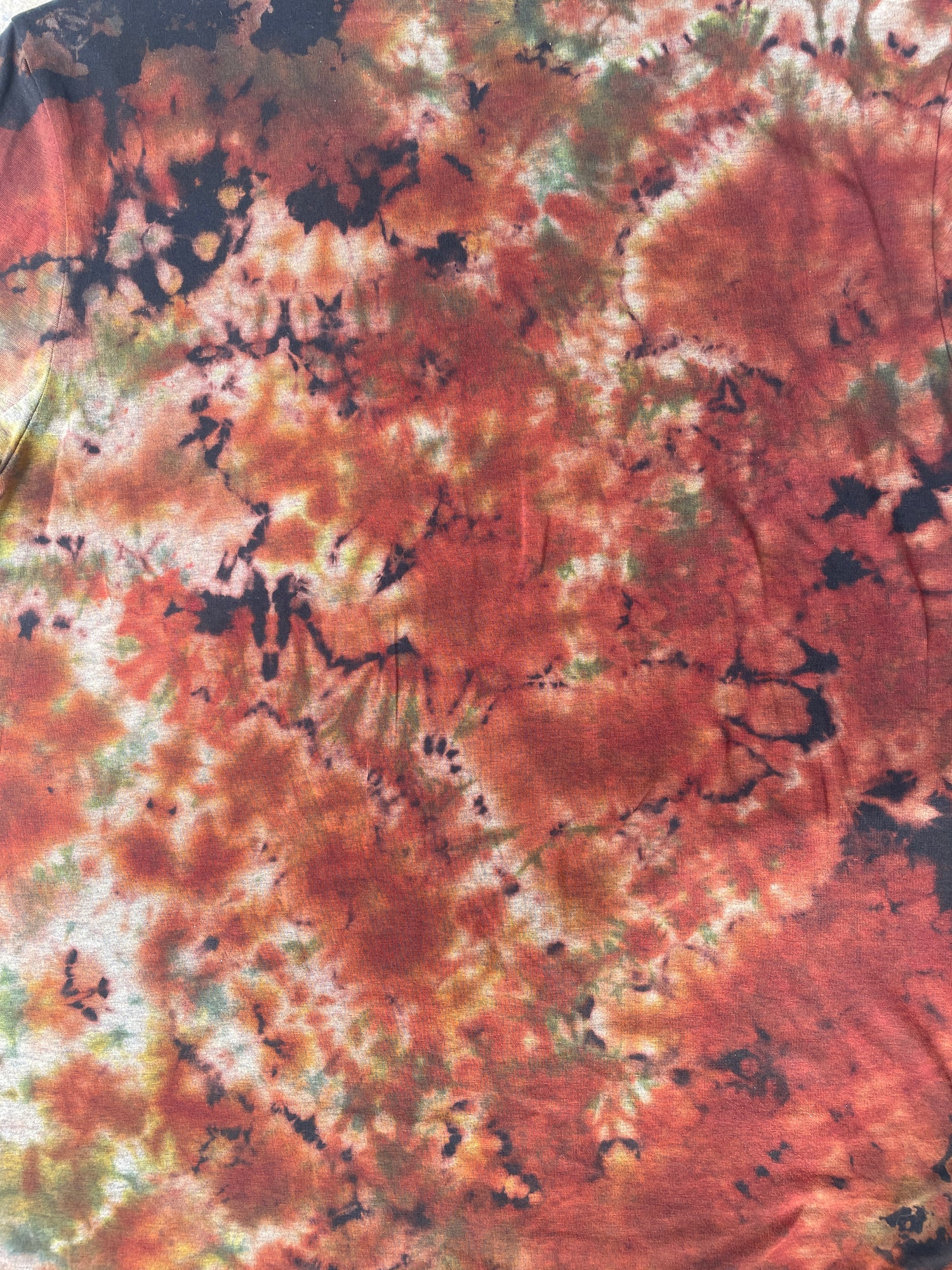 black t-shirt that's had portions of color removed and re-dyed with shades of dark orange and green crumpled tie dye pattern