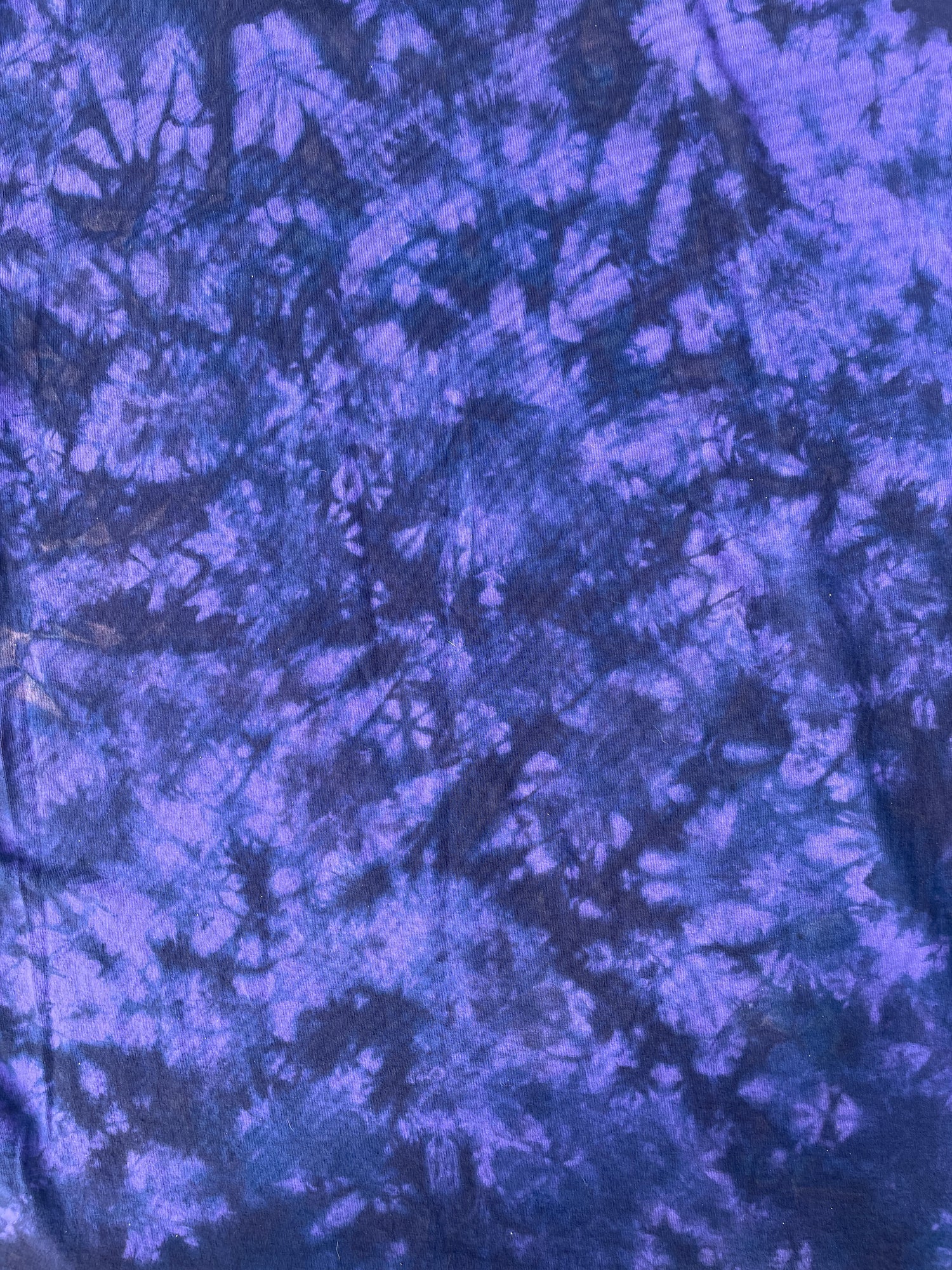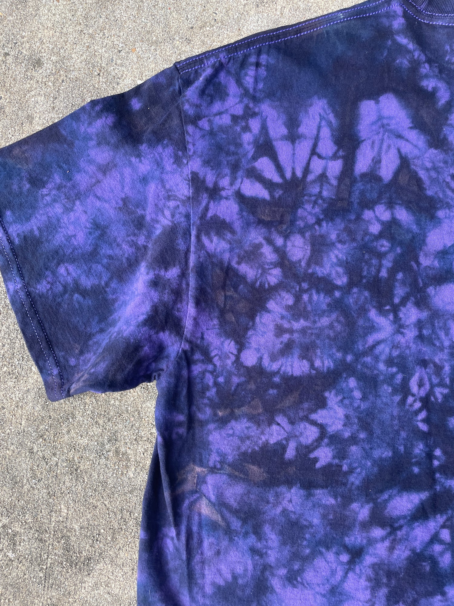 purple t-shirt that's had portions of color removed and re-dyed with shades of black and blue tie dye pattern