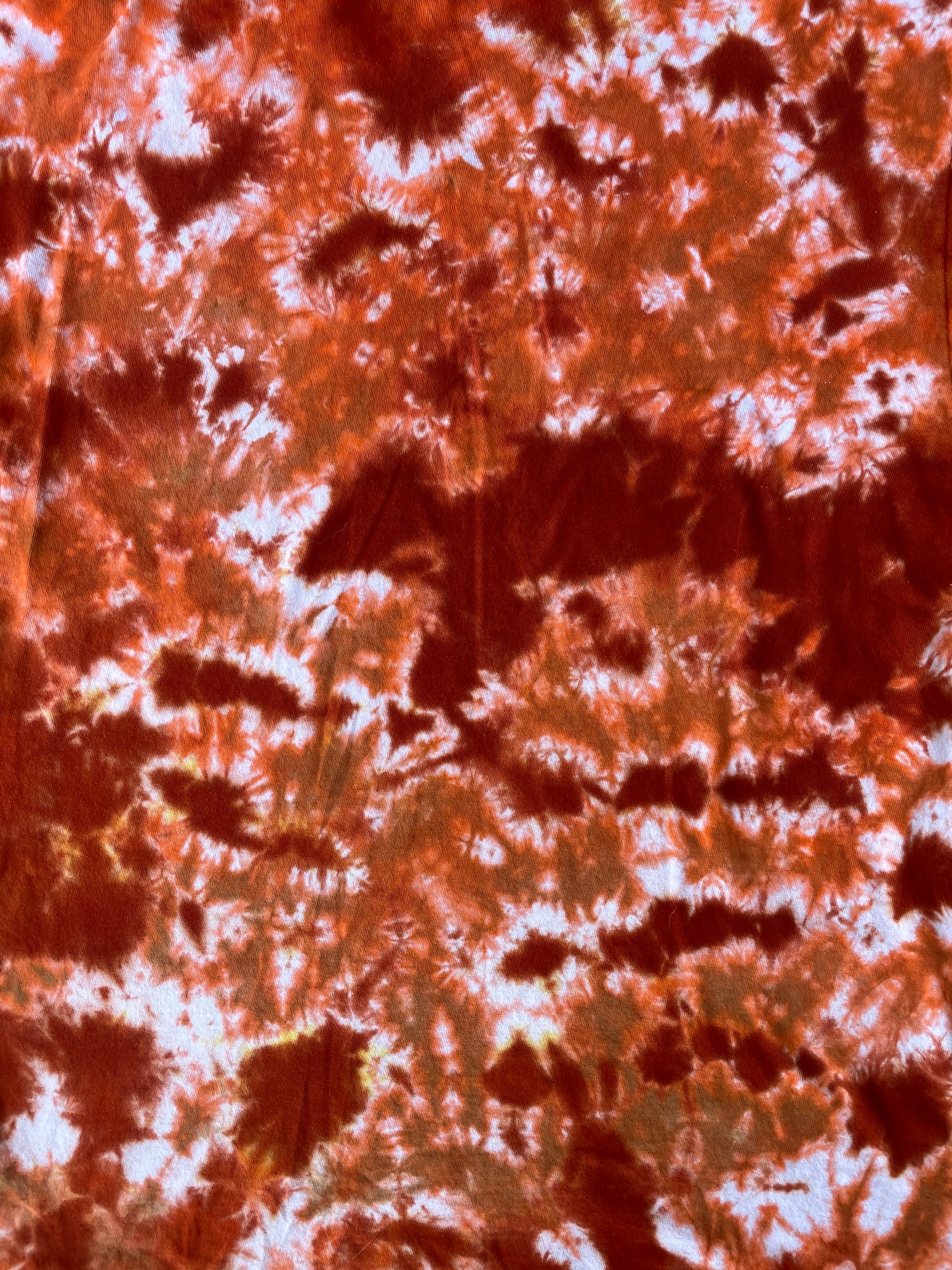 white t-shirt dyed with shades of red and orange crumpled tie dye pattern