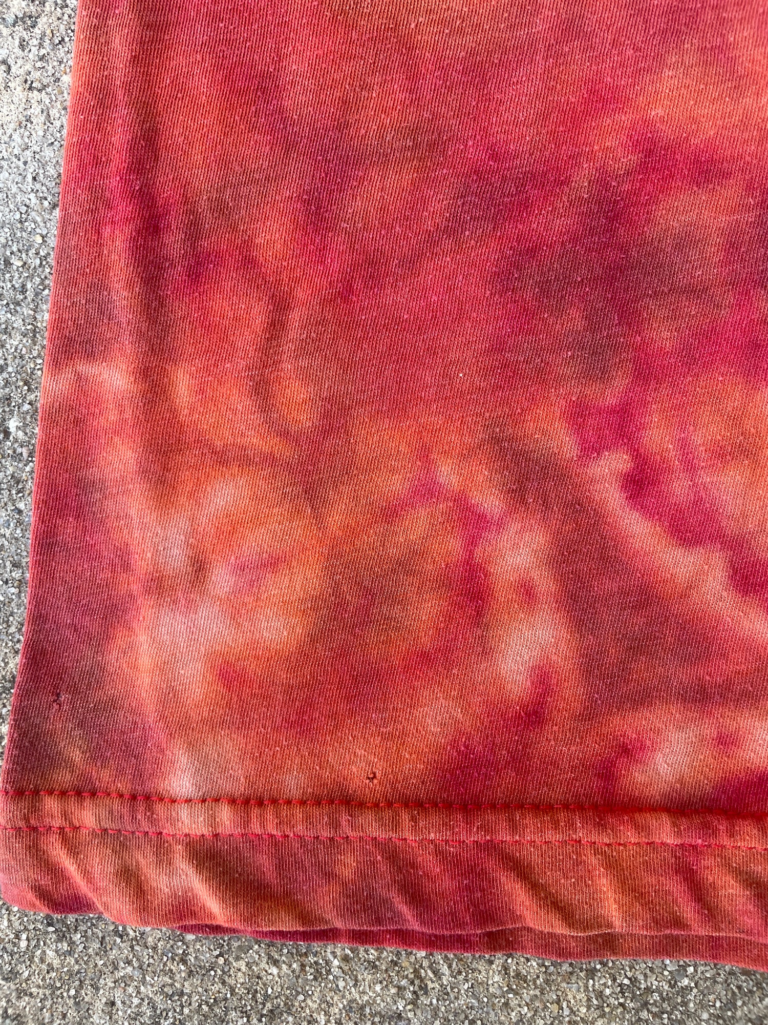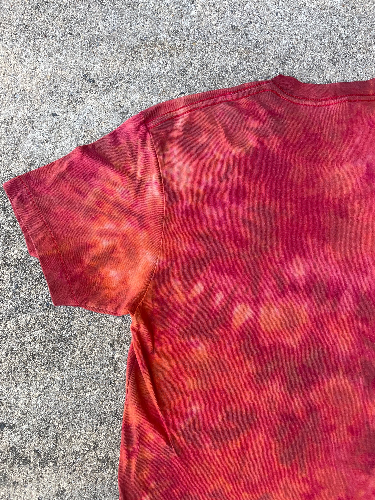 red t-shirt that's had portions of color removed and re-dyed with shades of red and range crumpled tie dye pattern