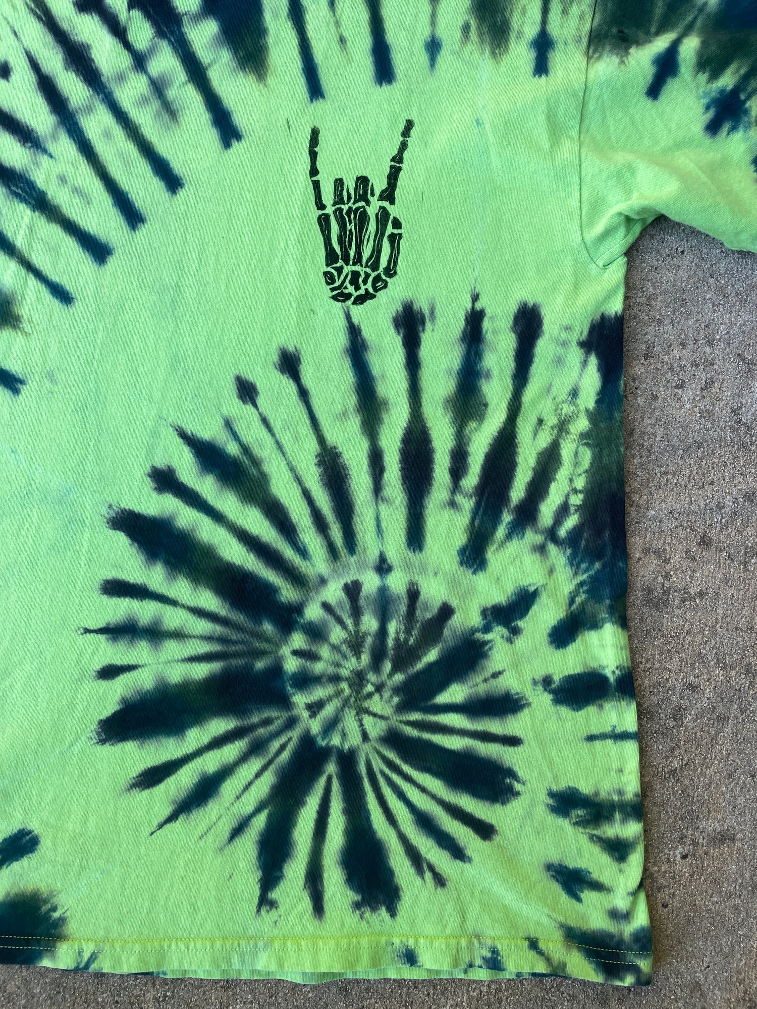 Hand-Printed Skeleton Rock On Green and Blue Spiral Tie Dye Short Sleeve T-Shirt | Men's Size Large